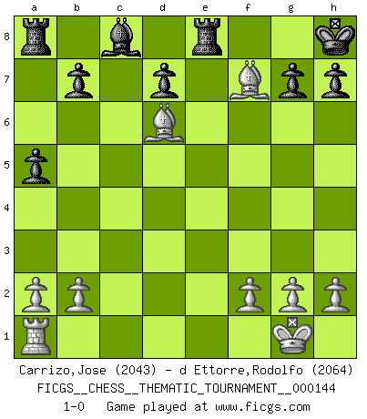 Last move : 1-0 2012 November 9 10:27:3 [Event "FICGS__CHESS__THEMATIC_TOURNAMENT__000144"] [Site "FICGS"] [Date "2012.03.04"] [Round "1"] [White "Carrizo,Jose"] [Black "d Ettorre,Rodolfo"] [Result "1-0"] [WhiteElo "2043"] [BlackElo "2064"] 1.e4 e5 2.Nf3 Nc6 3.Bc4 Bc5 4.c3 Nf6 5.d4 exd4 6.cxd4 Bb4+ 7.Nc3 Nxe4 8.O-O Bxc3 9.d5 Bf6 10.Re1 O-O 11.Rxe4 Ne7 12.d6 cxd6 13.Bg5 Ng6 14.Qd5 Ne5 15.Rxe5 dxe5 16.Nxe5 Qe7 17.Nxf7 Qxf7 18.Bxf6 Qxd5 19.Bxd5+ Kh8 20.Be7 Re8 21.Bd6 a5 22.Bf7 1-0 This chess game has been lost on time (started : 2012.03.04 15:38:51) Giuoco Piano : Greco's attack Kingside Castling by player White (move 8) Kingside Castling by player Black (move 10) Player White won this chess game. Follow this game move after move (download)You must take your opponent into a deep dark forest where 2+2=5, and the path leading out is only wide enough for one. (Mikhail Tal) Schach ist das Spiel, das die Verrückten gesund hält. (Albert Einstein) Las Aperturas te enseñan aperturas. ¡Los Finales te enseñan Ajedrez!. (Stephan Gerzadowicz) Il n'y a pas de prix trop élevé au scalp de l'ennemi. (Koblentz) The difference between perseverance and obstinacy is that one comes from a strong will, and the other from a strong won't. (Henry Ward Beecher)