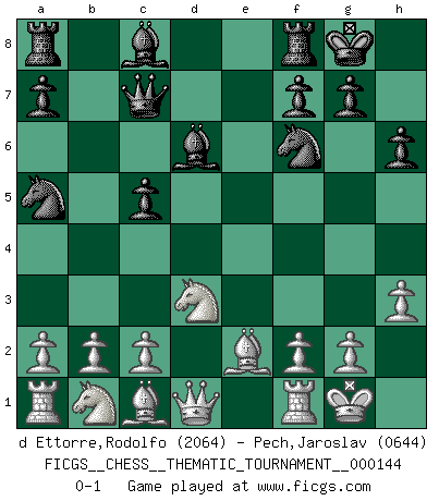 Last move : 0-1 2012 November 28 23:14:37 [Event "FICGS__CHESS__THEMATIC_TOURNAMENT__000144"] [Site "FICGS"] [Date "2012.03.04"] [Round "1"] [White "d Ettorre,Rodolfo"] [Black "Pech,Jaroslav"] [Result "0-1"] [WhiteElo "2064"] [BlackElo "0644"] 1.e4 e5 2.Nf3 Nc6 3.Bc4 Nf6 4.Ng5 d5 5.exd5 Na5 6.Bb5+ c6 7.dxc6 bxc6 8.Be2 h6 9.Nf3 e4 10.Ne5 Bd6 11.d4 exd3 12.Nxd3 Qc7 13.h3 O-O 14.O-O c5 0-1 This chess game has been lost on time (started : 2012.03.04 15:38:51) Two knights defense Kingside Castling by player Black (move 13) Kingside Castling by player White (move 14) Player Black won this chess game. Follow this game move after move (download)The Pawns are the soul of the game. (Francois Andre Danican Philidor) Über Frauen: Chess is better. (Robert James Fischer) Bobby Fischer es el mas grande genio de Ajedrez de todos los tiempos. (Alexander Kotov) Mais l'homme est une créature légère et illogique : semblable au joueur d'échecs, il n'aime que le processus du but à atteindre, non le but lui-même. (Dostoïevsky) He who is a good ruler must first have been ruled. (Aristotle)