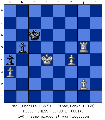 Last move : 1-0 2012 April 6 8:40:18 [Event "FICGS__CHESS__CLASS_E__000149"] [Site "FICGS"] [Date "2012.03.04"] [Round "1"] [White "Neil,Charlie"] [Black "Pipac,Darko"] [Result "1-0"] [WhiteElo "1225"] [BlackElo "1359"] 1.d4 e5 2.dxe5 Nc6 3.Nf3 d5 4.exd6 Qxd6 5.Nc3 Bg4 6.e4 O-O-O 7.Be2 Bxf3 8.Bxf3 Nf6 9.O-O Qxd1 10.Rxd1 Be7 11.Bf4 h6 12.e5 Rxd1+ 13.Rxd1 Nd7 14.Bg4 Rd8 15.a3 Bc5 16.e6 fxe6 17.Bxe6 Nd4 18.Bg4 a6 19.Nd5 c6 20.Nc3 Nxc2 21.h4 Nd4 22.Ne4 Bb6 23.Nd6+ Kb8 24.Nb5 Kc8 25.Nd6+ Kb8 26.Nf7 Kc8 27.Nxd8 Kxd8 28.Bxd7 Kxd7 29.Be3 c5 30.b4 Kc6 31.bxc5 Bxc5 32.Bxd4 Bxd4 33.Rxd4 g5 34.hxg5 hxg5 35.Rg4 b5 36.Rxg5 Kb6 37.f4 Kc6 38.Kf2 a5 39.Ke3 a4 40.Kd4 1-0 Queen's pawn : Charlick (Englund) gambit Queenside Castling by player Black (move 6) Kingside Castling by player White (move 9) 10 pieces endgame at move 34 : White KRPPPP , Black KPPP WHITE : King + 1 Rook 4 Pawns BLACK : King + 3 Pawns 9 pieces endgame at move 34 : White KRPPP , Black KPPP WHITE : King + 1 Rook 3 Pawns BLACK : King + 3 Pawns 8 pieces endgame at move 36 : White KRPPP , Black KPP WHITE : King + 1 Rook 3 Pawns BLACK : King + 2 Pawns Player White won this chess game. Follow this game move after move (download)Chess is mental torture. (Garry Kasparov) Ich verstehe Aljechins Kombinationen ganz gut; aber woher er diese Angriffschancen bekommt und wie er die Eröffnung behandelt das ist für mich ein Buch mit sieben Siegeln. (Rudolf Spielmann) Fischer era un maestro de claridad y un Rey del posicionamiento astuto. Sus oponentes podían ver hacia donde se dirigía pero eran impotentes para detenerlo. (Bruce Pandolfini) Le plus grand jeu de l'esprit jamais inventé, plus vous l'apprenez, plus vous y prenez du plaisir. (Garry Kasparov) It is the aim of the modern school, not to treat every position according to one general law, but according to the principle inherent in the position. (Richard Reti)