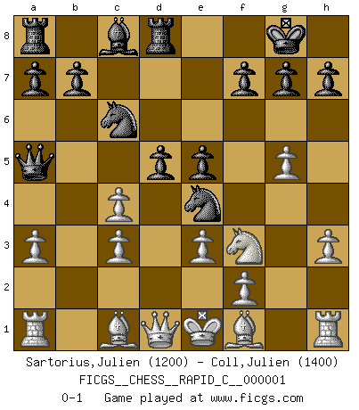 Last move : 0-1 2006 August 10 17:14:25 [Event "FICGS__CHESS__RAPID_C__000001"] [Site "FICGS"] [Date "2006.05.12"] [Round "1"] [White "Sartorius,Julien"] [Black "Coll,Julien"] [Result "0-1"] [WhiteElo "1200"] [BlackElo "1400"] 1.d4 Nf6 2.c4 c5 3.Nf3 cxd4 4.Nxd4 e5 5.Nf3 Nc6 6.Nc3 Bb4 7.a3 Bxc3+ 8.bxc3 Qa5 9.e3 O-O 10.h3 Rd8 11.g4 d5 12.g5 Ne4 0-1 This chess game has been lost on time (started : 2006.05.12 15:29:17) Benoni defense Kingside Castling by player Black (move 9) Player Black won this chess game. Follow this game move after move (download)Your body has to be in top condition. Your Chess deteriorates as your body does. You can't separate body from mind. (Bobby Fischer) Das Schachspiel übertrifft alle anderen Spiele so weit wie der Chimborasso einen Misthaufen. (Arthur Schopenhauer) Tu sabes que vas a perder. Aún cuando tenía la ventaja, yo sabía que iba a perder. - al estar jugando con Fischer (Andrew Soltis) Les Echecs ont trois composantes : le temps, l'espace et le matériel en dernier. (Mikhail Tal) It is a good thing for an uneducated man to read books of quotations. (Winston Churchill)
