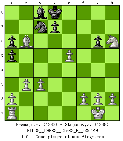 Last move : 1-0 2012 March 10 11:23:10 [Event "FICGS__CHESS__CLASS_E__000149"] [Site "FICGS"] [Date "2012.03.04"] [Round "1"] [White "Gramajo,Francisco"] [Black "Stoyanov,Zdravko"] [Result "1-0"] [WhiteElo "1233"] [BlackElo "1238"] 1.Nf3 c5 2.e4 a6 3.Bc4 Nc6 4.Bxf7+ Kxf7 5.O-O e5 6.c3 h6 7.d4 Qf6 8.dxe5 Nxe5 9.Qd5+ Ke8 10.Qxe5+ Qxe5 11.Nxe5 Nf6 12.Ng6 Rg8 13.e5 Nd5 14.Rd1 Nb6 15.b3 a5 16.Nxf8 Rxf8 17.Rd6 Ra6 18.Na3 Na8 19.Rxa6 bxa6 20.Nc4 Kd8 21.Ba3 Nc7 22.Bxc5 Rf5 23.Nd6 Ne6 24.Bb6+ Nc7 25.Nxf5 g6 26.Nxh6 1-0 Reti Opening Kingside Castling by player White (move 5) Player White won this chess game. Follow this game move after move (download)Strategy requires thought, tactics require observation. (Max Euwe) Die Arbeit ist etwas Unnatürliches. Die Faulheit allein ist göttlich. (Anatole France) El Ajedrez es un invernadero donde los frutos del carácter pueden madurar mas completamente que en la vida. (Edward Morgan Foster) La tactique est l'élément le plus important du milieu de jeu. (Siegbert Tarrasch) Kids, you tried your best and you failed miserably. The lesson is, never try. (Simpsons)