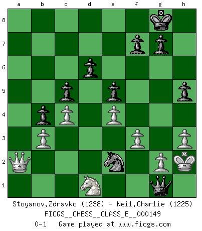 Last move : 0-1 2012 April 4 20:23:51 [Event "FICGS__CHESS__CLASS_E__000149"] [Site "FICGS"] [Date "2012.03.04"] [Round "1"] [White "Stoyanov,Zdravko"] [Black "Neil,Charlie"] [Result "0-1"] [WhiteElo "1238"] [BlackElo "1225"] 1.e4 e6 2.Nf3 c5 3.h3 Nc6 4.Bb5 Nge7 5.O-O a6 6.Bxc6 Nxc6 7.c4 Qc7 8.Re1 Be7 9.d3 b5 10.cxb5 axb5 11.Nbd2 d6 12.b3 O-O 13.Nh2 Bf6 14.Rb1 Bb7 15.Ndf3 Rxa2 16.Ng4 Bc3 17.Re2 Rfa8 18.Bb2 Bxb2 19.Rexb2 Rxb2 20.Rxb2 Qe7 21.Nd2 Bc8 22.f3 Nd4 23.Kh2 e5 24.Nf1 Be6 25.Nfe3 b4 26.Qb1 Ra3 27.Nc4 Bxc4 28.dxc4 Qg5 29.Ra2 Qf4+ 30.Kh1 Rxa2 31.Qxa2 h5 32.Nf2 Qe3 33.Kh2 Ne2 34.Nd1 Qg1+ 0-1 French defense Kingside Castling by player White (move 5) Kingside Castling by player Black (move 12) Player Black won this chess game. Follow this game move after move (download)There is only one thing Fischer does in Chess without pleasure: to lose ! (Boris Spassky) Fallen sollten polizeilich verboten werden. (Savielly Grigorievitsch Tartakower) Mi estilo es algo parecido entre un poco de Tal y Petrosian. (Reshevsky) Votre seul travail dans les ouvertures est d'obtenir un milieu de partie jouable. (Lajos Portish) Experience is the name we all give to our mistakes. (Oscar Wilde)