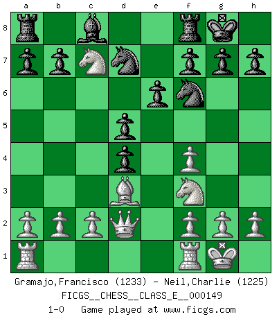 Last move : 1-0 2012 March 11 0:31:11 [Event "FICGS__CHESS__CLASS_E__000149"] [Site "FICGS"] [Date "2012.03.04"] [Round "1"] [White "Gramajo,Francisco"] [Black "Neil,Charlie"] [Result "1-0"] [WhiteElo "1233"] [BlackElo "1225"] 1.Nf3 Nf6 2.d4 e6 3.Bf4 d5 4.e3 Bd6 5.Nc3 O-O 6.Bd3 Bxf4 7.exf4 Nbd7 8.O-O c5 9.Qd2 cxd4 10.Nb5 Qc7 11.Nxc7 1-0 Reti Opening Kingside Castling by player Black (move 5) Kingside Castling by player White (move 8) Player White won this chess game. Follow this game move after move (download)As one by one I mowed them down, my superiority soon became apparent. (Jose Capablanca) Wir irren allesamt, nur jeder irrt anders. (Georg Christoph Lichtenberg) El Ajedrez es el arte del análisis. (Mikhail Botvinnik) On n'a jamais que l'âge auquel on a commence à jouer aux échecs car après on cesse de vieillir. (Capablanca) May the force be with you. (Han Solo in Star Wars ep.4)