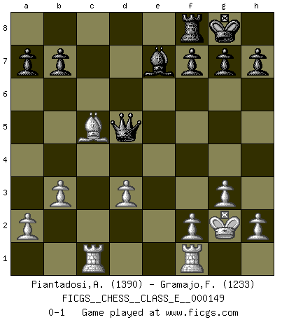 Last move : 0-1 2012 March 29 4:13:23 [Event "FICGS__CHESS__CLASS_E__000149"] [Site "FICGS"] [Date "2012.03.04"] [Round "1"] [White "Piantadosi,Angelo"] [Black "Gramajo,Francisco"] [Result "0-1"] [WhiteElo "1390"] [BlackElo "1233"] 1.c4 Nc6 2.Nc3 e5 3.d3 Nf6 4.Nf3 d5 5.cxd5 Nxd5 6.g3 Be7 7.Bg2 Be6 8.O-O O-O 9.Bd2 Qd7 10.Rc1 Rad8 11.Nxd5 Bxd5 12.Bc3 Qe6 13.b3 e4 14.Nd4 Nxd4 15.Bxd4 exd3 16.Qxd3 Bxg2 17.Kxg2 c5 18.Bxc5 Rxd3 19.exd3 Qd5+ 0-1 English Opening Kingside Castling by player White (move 8) Kingside Castling by player Black (move 8) Player Black won this chess game. Follow this game move after move (download)Chess is not like life... it has rules ! (Mark Pasternak) Der Freibauer hat für mich eine Seele, genau wie der Mensch, Wünsche, die unerkannt in ihm schlummern, und Befürchtungen, von deren Existenz er selbst kaum ahnt. (Aaron Nimzowitsch) Yo jugué Ajedrez con el y a veces le pude haber ganado solo que siempre devuelve su última jugada y juega la partida de manera diferente. (Mark Twain) Il (Jacob Murray) ne joue pas pour le bon coup, mais pour le meilleur. (Eloi Relange) If you don't practice you don't deserve to win. (Andre Agassi)