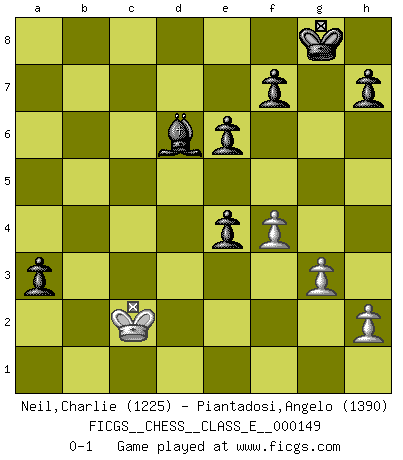 Last move : 0-1 2012 May 12 20:39:45 [Event "FICGS__CHESS__CLASS_E__000149"] [Site "FICGS"] [Date "2012.03.04"] [Round "1"] [White "Neil,Charlie"] [Black "Piantadosi,Angelo"] [Result "0-1"] [WhiteElo "1225"] [BlackElo "1390"] 1.e4 c5 2.g3 Nc6 3.Bg2 b6 4.Nc3 Bb7 5.Nge2 d6 6.d4 cxd4 7.Nxd4 Nxd4 8.Qxd4 Nf6 9.O-O e6 10.Bg5 Be7 11.Rad1 O-O 12.Bxf6 gxf6 13.f4 Rc8 14.Nb5 a6 15.Nc3 b5 16.a4 bxa4 17.Qxa4 Qb6+ 18.Kh1 Bc6 19.Qd4 Qxd4 20.Rxd4 Ba8 21.Rfd1 Rfd8 22.Na4 Rxc2 23.Nb6 Rxb2 24.Nc4 Rb4 25.Nxd6 Rxd4 26.Rxd4 Rxd6 27.Rxd6 Bxd6 28.Kg1 a5 29.Kf1 a4 30.Ke2 a3 31.Kd2 f5 32.Kc2 Bxe4+ 33.Bxe4 fxe4 0-1 Sicilian : Steinitz variation Kingside Castling by player White (move 9) Kingside Castling by player Black (move 11) Player Black won this chess game. Follow this game move after move (download)No Chess Grandmaster is normal; they only differ in the extent of their madness. (Viktor Korchnoi) Dieses schreckliche Gefühl, dass ich gegen eine Maschine spielte, die niemals Fehler macht, zerschmetterte meinen Widerstand. (Mark Taimanov) Observen a Garry Kasparov. Después de una derrota, invariablemente el gana la próxima partida. Prácticamente hace pedazos a su siguiente oponente. Eso es algo que tenemos que aprender a lograr. (Maurice Ashley) On croit qu'il y a plus de mauvais joueurs que de bons joueurs, c'est faux : Il y a autant de joueurs qui gagnent que de joueurs qui perdent. (Philippe Geluck) When you stop learning you start dying. (Scott Adams)