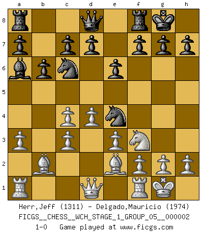 Last move : 1-0 2007 March 9 7:4:36 [Event "FICGS__CHESS__WCH_STAGE_1_GROUP_05__000002"] [Site "FICGS"] [Date "2007.01.16"] [Round "1"] [White "Herr,Jeff"] [Black "Delgado,Mauricio"] [Result "1-0"] [WhiteElo "1311"] [BlackElo "1974"] 1.d4 Nf6 2.c4 e6 3.Nc3 Bb4 4.a3 Bxc3+ 5.bxc3 b6 6.e3 Ba6 7.Nf3 Nc6 8.Be2 O-O 9.O-O Ne4 10.Bb2 1-0 This chess game has been lost on time (started : 2007.01.16 15:15:54) Nimzo-Indian : Saemisch variation Kingside Castling by player Black (move 8) Kingside Castling by player White (move 9) Player White won this chess game. Follow this game move after move (download)By the beauty of his games, the clarity of his play, and the brilliance of his ideas, Fischer made himself an artist of the same stature as Brahms, Rembrandt, and Shakespeare. (David Levy) Wir können eben der zündenden Macht des Opfers nicht wiederstehen, denn die Begeisterung für das Opfer liegt in der Natur des Menschen. (Rudolf Spielmann) Me gusta decir que Bobby Fischer fue el mejor jugador que jamás haya existido. Pero lo que hizo de Fischer un genio, fue su habilidad de mezclar una frescura y pragmatismo Americano con ideas Rusas acerca de la estrategia. (Bruce Pandolfini) Toute estimation doit être constamment réévaluée. (Jacob Estrin) Panic is a sudden desertion of us, an a going over to the enemy of our imagination. (Christian Nevell Bovee)
