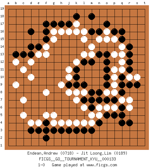 Last move : 1-0 2012 August 25 2:50:1 [Event "FICGS__GO__TOURNAMENT_KYU__000133"] [Site "FICGS"] [Date "2012.03.05"] [Round "1"] [Black "Endean,Andrew"] [White "Jit Loong,Lim"] [Result "1-0"] [Rating 1 "0718"] [Rating 2 "0189"] 1.r4 d4 2.q16 d10 3.d16 k4 4.q10 k16 5.h17 j16 6.j17 h16 7.g17 g16 8.f17 f14 9.f16 g15 10.f15 f13 11.e14 e13 12.d14 d12 13.d13 k17 14.k18 c11 15.c13 b12 16.b13 c7 17.m3 m4 18.n4 l4 19.l3 g5 20.k10 f8 21.k3 j4 22.j3 h4 23.h3 j8 24.m8 m14 25.o13 o16 26.o17 n15 27.p16 l15 28.n16 o15 29.m16 p15 30.q15 q14 31.r14 q13 32.r13 q12 33.r12 q11 34.r11 p10 35.q9 p9 36.o7 p6 37.p7 q7 38.q8 p8 39.q6 r7 40.p5 o6 41.q4 n5 42.o5 n6 43.n7 m7 44.m6 m5 45.l7 l6 46.m7 k7 47.l9 j11 48.k11 k12 49.l12 l13 50.m12 j10 51.j9 h9 52.k9 k8 53.o9 l8 54.o10 r10 55.r9 p11 56.o11 r6 57.q5 s10 58.s9 o8 59.n8 l16 60.m18 f3 61.g3 g4 62.f2 e4 63.e3 c5 64.f4 f5 65.f3 b9 66.d3 m13 67.n13 p13 68.o12 1-0 This go game has been lost on time (started : 2012.03.05 10:38:31) Here are the names of the openings (joseki) played in the four corners : Corner q16 : q16 m14 Hoshi (Hwajeom, Seongjeom, Xingwei`) 4-4 Point. The star or hoshi (4-4) point, emphasizing influence at the potential expense of territory. Player Black won this Go (weiqi, baduk) game. Follow this game move after move (download)Never try to cut bamboo joints. (Anonymous) My poor ole parrot... Is not in the circulation of displays ....poo hoo hoo :) (Wayne Lowrance's enigma)