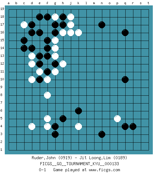 Last move : 0-1 2012 May 28 14:30:40 [Event "FICGS__GO__TOURNAMENT_KYU__000133"] [Site "FICGS"] [Date "2012.03.05"] [Round "1"] [Black "Ruder,John"] [White "Jit Loong,Lim"] [Result "0-1"] [Rating 1 "0919"] [Rating 2 "0189"] 1.q4 d4 2.d16 d10 3.q16 k4 4.q10 k16 5.g4 f5 6.h5 f4 7.g3 d15 8.c15 d13 9.d14 e15 10.c14 e14 11.e13 d12 12.f13 g13 13.f14 g15 14.f15 f16 15.e16 g14 16.g16 f17 17.g17 g18 18.f18 e17 19.e18 c17 20.d17 h16 21.h17 j16 22.k6 f8 23.n3 p5 24.r4 j17 25.h18 j18 26.n17 f12 27.e12 e11 28.g12 h12 29.f11 g11 30.e10 f10 0-1 This go game has been lost on time (started : 2012.03.05 10:38:31) Here are the names of the openings (joseki) played in the four corners : Corner d4 : d4 g4 Hoshi (Hwajeom, Seongjeom, Xingwei`) 4-4 Point. The star or hoshi (4-4) point, emphasizing influence at the potential expense of territory. Niken Takagakari (Dukan Nop'dakeolch'im, E`r Gaojia, 2-Space High Approach). Black 2 is a light approach move. Rarely played in even games, Black 2 is typically employed in handicap games. White continues with 6-4 or 3-10. In Korean Sunjang Baduk White has a stone on 8-4. Corner d16 : d16 d15 Hoshi (Hwajeom, Seongjeom, Xingwei`) 4-4 Point. The star or hoshi (4-4) point, emphasizing influence at the potential expense of territory. Player White won this Go (weiqi, baduk) game. Follow this game move after move (download)There are possible things, impossible things, and things that happen. Sometimes things happen that were impossible. (Pierre Audouard) Creativity is allowing yourself to make mistakes. Art is knowing which ones to keep. (Scott Adams)
