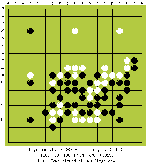 Last move : 1-0 2012 September 15 19:14:41 [Event "FICGS__GO__TOURNAMENT_KYU__000133"] [Site "FICGS"] [Date "2012.03.05"] [Round "1"] [Black "Engelhard,Christof"] [White "Jit Loong,Lim"] [Result "1-0"] [Rating 1 "0300"] [Rating 2 "0189"] 1.d4 q16 2.q4 k16 3.d16 q10 4.q9 d10 5.d9 o10 6.q7 q8 7.r8 p8 8.p9 o9 9.o8 p7 10.o7 p6 11.r9 p10 12.q6 o6 13.n7 m7 14.n6 n5 15.m6 l6 16.m5 m4 17.l5 k5 18.l7 m8 19.k6 n8 20.o5 n4 21.p5 l4 22.r10 r11 23.s11 r12 24.s12 k7 25.l8 l9 26.k8 j7 27.k9 k10 28.m9 n9 29.l10 l11 30.n10 o11 31.j6 h6 32.j5 k4 33.h7 j8 34.g6 h5 35.h4 g5 36.f5 g4 37.g3 j9 38.j10 k11 39.h9 h8 40.g8 j11 41.j8 h10 42.j9 g9 43.g10 1-0 This go game has been lost on time (started : 2012.03.05 10:38:31) Here are the names of the openings (joseki) played in the four corners : Corner d16 : d16 j11 Hoshi (Hwajeom, Seongjeom, Xingwei`) 4-4 Point. The star or hoshi (4-4) point, emphasizing influence at the potential expense of territory. Player Black won this Go (weiqi, baduk) game. Follow this game move after move (download)Atari, atari is vulgar play. (Anonymous) Always remember that you are unique; just like everyone else. (Unknown)