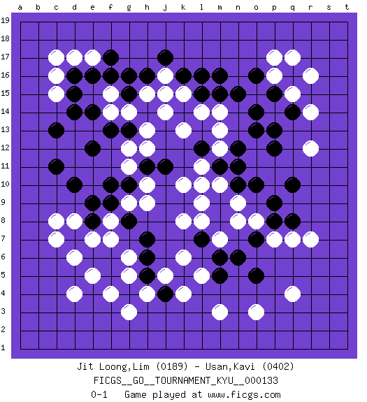 Last move : 0-1 2012 August 30 3:57:43 [Event "FICGS__GO__TOURNAMENT_KYU__000133"] [Site "FICGS"] [Date "2012.03.05"] [Round "1"] [Black "Jit Loong,Lim"] [White "Usan,Kavi"] [Result "0-1"] [Rating 1 "0189"] [Rating 2 "0402"] 1.d16 q4 2.d10 d4 3.k16 q17 4.q16 p17 5.o16 p16 6.p15 q15 7.m16 r16 8.n15 p14 9.o14 k4 10.q10 r7 11.p12 m13 12.o13 k13 13.g16 k10 14.f13 c8 15.d7 d8 16.e8 e7 17.e6 f7 18.e9 c7 19.q8 q7 20.o10 k8 21.q14 r14 22.p13 c17 23.c13 d17 24.e16 e17 25.f17 c15 26.d14 c16 27.d15 h12 28.g10 j15 29.e12 j16 30.j17 k15 31.l16 d6 32.f6 g6 33.f5 g5 34.g4 f4 35.o5 o3 36.h5 h4 37.h6 e5 38.c11 p7 39.o7 o8 40.p8 n8 41.p9 n9 42.n10 m10 43.m11 l11 44.m9 l10 45.l12 m12 46.n11 h9 47.n12 m14 48.m15 r12 49.l15 l14 50.h16 g14 51.h14 h15 52.g13 h13 53.g15 f14 54.e14 f15 55.f16 j14 56.m5 m3 57.n6 m7 58.m6 k6 59.k5 j5 60.j4 l5 61.l7 l8 62.m8 l9 63.h7 g9 64.f10 g3 65.g8 f8 66.f9 h10 67.h11 g11 68.j11 g12 0-1 This go game has been lost on time (started : 2012.03.05 10:38:31) Here are the names of the openings (joseki) played in the four corners : Corner q16 : q17 q16 Komoku (Somok, Xiao~mu`) 3-4 Point. The komoku (3-4) point is the traditional corner enclosure move.. Player White won this Go (weiqi, baduk) game. Follow this game move after move (download)The saki bottle shape is negative. (Anonymous) Memory is a crazy woman that hoards colored rags and throws away food. (Austin O'Malley)