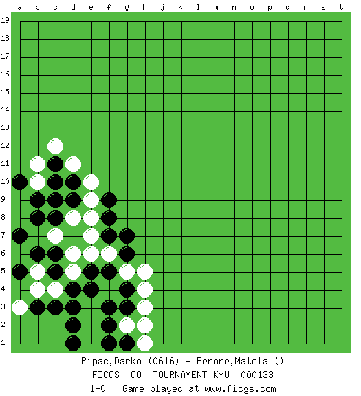 Last move : 1-0 2012 May 25 2:14:39 [Event "FICGS__GO__TOURNAMENT_KYU__000133"] [Site "FICGS"] [Date "2012.03.05"] [Round "1"] [Black "Pipac,Darko"] [White "Benone,Mateia"] [Result "1-0"] [Rating 1 "0616"] 1.d4 d5 2.e4 f4 3.e5 e3 4.d3 c4 5.c3 e6 6.f5 f6 7.f3 g5 8.g4 e2 9.f2 f1 10.d2 e1 11.d1 g2 12.g3 h3 13.g1 h2 14.c5 d6 15.c6 b5 16.b6 a6 17.a7 a8 18.a5 b4 19.b3 a3 20.b8 a9 21.b9 b10 22.a10 h4 23.g6 h5 24.g7 c7 25.c8 h1 26.f1 d8 27.d9 e9 28.f8 e8 29.f7 e7 30.f9 e10 31.d10 d11 32.c10 b11 33.c11 c12 34.c9 1-0 This go game has been lost on time (started : 2012.03.05 10:38:31) Here are the names of the openings (joseki) played in the four corners : Corner d4 : d4 d5 Hoshi (Hwajeom, Seongjeom, Xingwei`) 4-4 Point. The star or hoshi (4-4) point, emphasizing influence at the potential expense of territory. Player Black won this Go (weiqi, baduk) game. Follow this game move after move (download)Don't get surrounded ! Ever ! (Anonymous) Those who make the worst use of their time are the first to complain of its brevity. (Jean de la Bruyere)