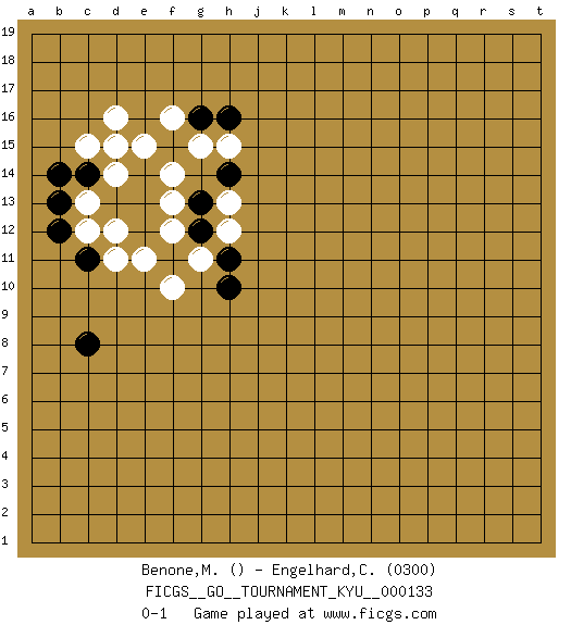 Last move : 0-1 2012 May 23 14:2:47 [Event "FICGS__GO__TOURNAMENT_KYU__000133"] [Site "FICGS"] [Date "2012.03.05"] [Round "1"] [Black "Benone,Mateia"] [White "Engelhard,Christof"] [Result "0-1"] [Rating 2 "0300"] 1.c8 d16 2.d15 e15 3.e14 d14 4.d13 c15 5.c14 d15 6.f15 f16 7.g16 f14 8.e13 g15 9.h16 c13 10.b14 c12 11.b12 d12 12.e12 d11 13.b13 e11 14.f11 f12 15.g12 f13 16.c11 g11 17.h11 f10 18.h10 h12 19.g13 h13 20.h14 h15 0-1 This go game has been lost on time (started : 2012.03.05 10:38:31) Here are the names of the openings (joseki) played in the four corners : Corner d16 : d16 d15 Hoshi (Hwajeom, Seongjeom, Xingwei`) 4-4 Point. The star or hoshi (4-4) point, emphasizing influence at the potential expense of territory. Player White won this Go (weiqi, baduk) game. Follow this game move after move (download)More haste less speed. (John Fairbairn) The Internet is the first thing that humanity has build that humanity doesn't understand, the largest experiment in anarchy that we have ever had. (Eric Schmidt)