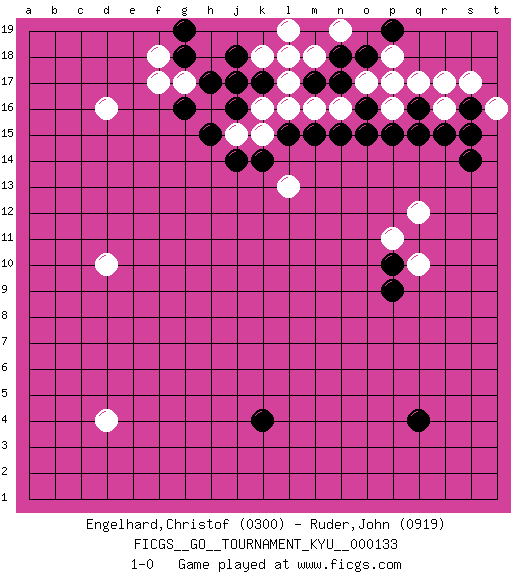 Last move : 1-0 2012 June 8 3:38:33 [Event "FICGS__GO__TOURNAMENT_KYU__000133"] [Site "FICGS"] [Date "2012.03.05"] [Round "1"] [Black "Engelhard,Christof"] [White "Ruder,John"] [Result "1-0"] [Rating 1 "0300"] [Rating 2 "0919"] 1.q4 d16 2.q16 d4 3.k4 o17 4.o16 n16 5.n15 p16 6.o15 q17 7.n17 m16 8.p15 p17 9.m15 l16 10.m17 l17 11.l18 k18 12.o18 p18 13.p19 r16 14.q15 r17 15.r15 q10 16.p10 p11 17.p9 q12 18.k17 k16 19.j17 m18 20.n18 l19 21.j18 l13 22.l15 k15 23.k14 h16 24.j16 j15 25.h15 g17 26.j14 l18 27.g18 f18 28.g16 n19 29.h17 f17 30.g19 d10 31.s16 s17 32.s14 t16 33.s15 1-0 This go game has been lost on time (started : 2012.03.05 10:38:31) Here are the names of the openings (joseki) played in the four corners : Corner q16 : q16 o17 Hoshi (Hwajeom, Seongjeom, Xingwei`) 4-4 Point. The star or hoshi (4-4) point, emphasizing influence at the potential expense of territory. Ikken Kakari (Hankan Keolch'im, Yi Gua`jiao~, 1-Space Low Approach). White 2 is the standard approach move to the 4-4. Corner d16 : d16 j17 Hoshi (Hwajeom, Seongjeom, Xingwei`) 4-4 Point. The star or hoshi (4-4) point, emphasizing influence at the potential expense of territory. Player Black won this Go (weiqi, baduk) game. Follow this game move after move (download)Keep inessential ataris till the end. (Anonymous) Perhaps the current trend of many chess professionals taking up the more lucrative pastime of poker is not a wholly negative one. It may not be too late for humans to relearn how to take risks in order to innovate and thereby maintain the advanced lifestyles we enjoy. And if it takes a poker-playing supercomputer to remind us that we can't enjoy the rewards without taking the risks, so be it. (The Chess Master and the Computer, by Garry Kasparov - 2010)