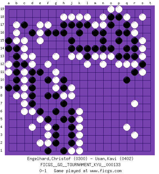 Last move : 0-1 2012 June 9 23:48:32 [Event "FICGS__GO__TOURNAMENT_KYU__000133"] [Site "FICGS"] [Date "2012.03.05"] [Round "1"] [Black "Engelhard,Christof"] [White "Usan,Kavi"] [Result "0-1"] [Rating 1 "0300"] [Rating 2 "0402"] 1.d16 q4 2.q16 d4 3.q10 k4 4.k16 c10 5.d11 c11 6.c12 d12 7.e11 c13 8.b12 d13 9.b13 c15 10.b14 c14 11.d10 c9 12.d9 c8 13.b11 b15 14.a15 b16 15.c17 b17 16.d8 c7 17.d7 d6 18.e6 e5 19.f5 f4 20.g6 f17 21.h16 e15 22.f16 e16 23.g16 e17 24.g4 f3 25.h5 g13 26.j15 r7 27.n15 r17 28.q17 r16 29.r13 s14 30.r15 s15 31.q14 s13 32.s12 q18 33.p18 s18 34.r14 n12 35.j4 k5 36.j5 k6 37.j6 o13 38.p13 p12 39.o14 m13 40.p15 r12 41.r11 q12 42.q13 s11 43.n14 n13 44.m14 k13 45.k14 j13 46.j14 r3 47.l13 l12 48.l14 j9 49.h9 j8 50.h7 h8 51.g8 g9 52.h10 g10 53.f8 g11 54.f10 f12 55.g3 f2 56.g2 k3 57.j3 k2 58.j2 j18 59.j17 h18 60.h17 k18 61.k17 l18 62.l17 m17 63.m16 n17 64.o17 n18 65.n16 p19 66.o18 o19 67.p16 j1 68.h1 k1 69.f1 e2 70.b10 c6 71.b9 b8 72.a9 a11 73.a14 a12 0-1 Here are the names of the openings (joseki) played in the four corners : Player White won this Go (weiqi, baduk) game. Follow this game move after move (download)If White takes all four corners, Black should resign; if Black takes all four corners, Black should also resign. (David Kent) History is the quarrels of popes and kings, with wars or pestilences in every page; the men all so good for nothing, and hardly any women at all. (Jane Austen)