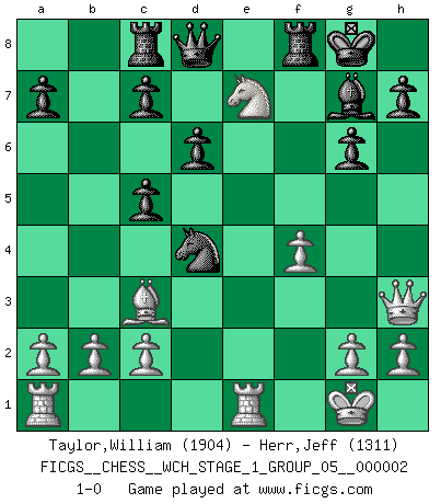 Last move : 1-0 2007 February 8 19:2:57 [Event "FICGS__CHESS__WCH_STAGE_1_GROUP_05__000002"] [Site "FICGS"] [Date "2007.01.16"] [Round "1"] [White "Taylor,William"] [Black "Herr,Jeff"] [Result "1-0"] [WhiteElo "1904"] [BlackElo "1311"] 1.e4 e5 2.Nf3 Nc6 3.Bb5 Nf6 4.O-O d6 5.Re1 Bd7 6.d4 exd4 7.Nxd4 Be7 8.Nc3 O-O 9.Bxc6 bxc6 10.Qf3 c5 11.Nf5 Bxf5 12.exf5 Nd7 13.Bd2 Ne5 14.Qh5 Bf6 15.Nd5 g6 16.Qh3 Bg7 17.Ba5 Rc8 18.f4 Nc6 19.Bc3 Nd4 20.fxg6 fxg6 21.Ne7+ 1-0 Ruy Lopez : Berlin defense, 4.O-O, d6 Kingside Castling by player White (move 4) Kingside Castling by player Black (move 8) Player White won this chess game. Follow this game move after move (download)Fischer is under obligation to nobody. (Joseph Platz) Ich suche im Schach immer etwas Eigenes. Riskantes Spiel im Stile schachlicher Musketiere ist nicht meine Sache, auch wenn es vielen Freunden scharfer Wendungen gefällt. (Anatoly Karpov) ¿Que sería del Ajedrez sin errores graciosos?. (Kurt Richter) La victoire dans une partie d'Echecs appartient la plupart du temps à celui qui voit un peu plus loin que l'adversaire. (Lasker) Logic : The art of thinking and reasoning in strict accordance with the limitations and incapacities of the human misunderstanding. (Ambrose Bierce)