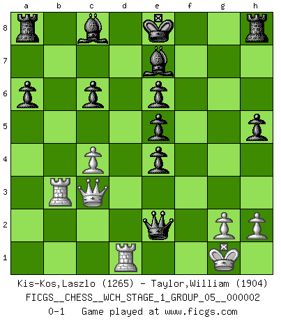 Last move : 0-1 2007 February 8 16:8:24 [Event "FICGS__CHESS__WCH_STAGE_1_GROUP_05__000002"] [Site "FICGS"] [Date "2007.01.16"] [Round "1"] [White "Kis-Kos,Laszlo"] [Black "Taylor,William"] [Result "0-1"] [WhiteElo "1265"] [BlackElo "1904"] 1.e4 c5 2.Nf3 d6 3.d4 cxd4 4.Nxd4 Nf6 5.Nc3 a6 6.Bg5 e6 7.f4 Qb6 8.Qd2 Qxb2 9.Rb1 Qa3 10.f5 Nc6 11.fxe6 fxe6 12.Nxc6 bxc6 13.e5 dxe5 14.Bxf6 gxf6 15.Ne4 Be7 16.Be2 h5 17.Rb3 Qa4 18.c4 f5 19.O-O fxe4 20.Qc3 Qxa2 21.Rd1 Qxe2 0-1 Sicilian : Najdorf, 7...Qb6 Kingside Castling by player White (move 19) Player Black won this chess game. Follow this game move after move (download)Excellence at Chess is one mark of a scheming mind. (Sir Arthur Conan Doyle) Ich würde mich als ganz normalen Jungen bezeichnen [Im Alter von 12]. (Sergej Karjakin) De eso se trata el Ajedrez. Un día le das una lección a tu oponente y al día siguiente el te da una a tí. (Bobby Fischer) La vie est comme un jeu d'échecs : nous esquissons un plan, mais celui-ci est tributaire de ce que daignent faire l'adversaire aux échecs et le destin dans la vie. (Arthur Schopenhauer) All battles are fought by scared men who'd rather be someplace else. (John Wayne in the movie In harm's way)