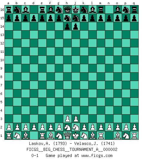 Last move : 0-1 2012 April 8 11:29:30 [Event "FICGS__BIG_CHESS__TOURNAMENT_A__000002"] [Site "FICGS"] [Date "2012.03.09"] [Round "1"] [White "Laskov,Andrei"] [Black "Velasco,Jose Maria"] [Result "0-1"] [WhiteElo "1793"] [BlackElo "1741"] 0-1 This big chess game has been lost on time (started : 2012.03.09 10:2:0) Follow this game move after move (download)Pawn endings are to Chess what putting is to golf. (Cecil Purdy) Ich möchte Schüler heranbilden, die das Vermögen haben, selbst zu denken und Kritik zu üben. (Emanuel Lasker) El Ajedrez es un terrible juego. Si no controlas el centro, tu oponente tiene una posición mas holgada. Si tienes control del centro, ¡entonces realmente tu tienes algo de que preocuparte!. (Siegbert Tarrasch) Psychologiquement, tu dois avoir confiance en toi même, mais cette confiance doit être basée sur des faits. (Robert Fischer) Perhaps chess is the wrong game for the times (The Chess Master and the Computer, by Garry Kasparov - 2010)