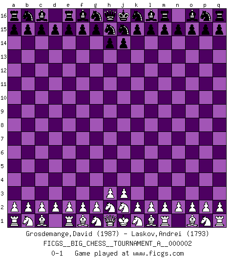 Last move : 0-1 2012 April 8 11:29:30 [Event "FICGS__BIG_CHESS__TOURNAMENT_A__000002"] [Site "FICGS"] [Date "2012.03.09"] [Round "1"] [White "Grosdemange,David"] [Black "Laskov,Andrei"] [Result "0-1"] [WhiteElo "1987"] [BlackElo "1793"] 0-1 This big chess game has been lost on time (started : 2012.03.09 10:2:0) Follow this game move after move (download)Kasparov : J'adoube , Ivanchuk : S'il vous plaît ! (Garry Kasparov & Vassily Ivanchuk, Linares 1997) Die jungen Leute sollen verstehen, dass sie noch etwas von mir lernen können – und müssen. (Viktor Kortschnoi) El jugador de combinación piensa hacia adelante; comienza de la posición dada y trabaja las movidas contundentes en su mente. (Emanuel Lasker) Il vaut toujours mieux jouer un plan faux de façon logique que de n'avoir pas de plan du tout. (Victor Kortchnoï) A cynic is a man who knows the price of everything but the value of nothing. (Oscar Wilde)
