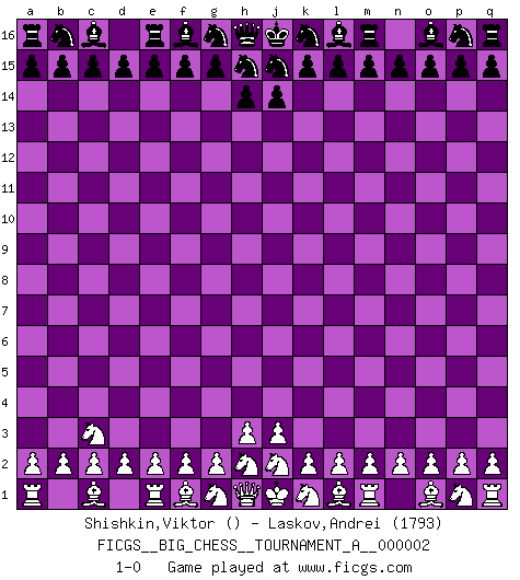 Last move : 1-0 2012 May 2 0:40:25 [Event "FICGS__BIG_CHESS__TOURNAMENT_A__000002"] [Site "FICGS"] [Date "2012.03.09"] [Round "1"] [White "Shishkin,Viktor"] [Black "Laskov,Andrei"] [Result "1-0"] [WhiteElo ""] [BlackElo "1793"] 1.b1-c3 1-0 This big chess game has been lost on time (started : 2012.03.09 10:2:0) Follow this game move after move (download)After black's reply to 1.e4 with 1..e5, leaves him always trying to get into the game. (Howard Staunton) Jeder leidlich begabte Spieler, er braucht keineswegs hervorragend veranlagt zu sein, kann es zum Meister bringen. Aber das ist ja auch gar nicht nötig! Der richtige Standpunkt ist es, zu seinem Vergnügen zu spielen, und man glaube ja nicht, dass der Genuss proportional dem Können sei. (Siegbert Tarrasch) Coloca el contenido de las piezas del Ajedrez en un sombrero, agitalo vigorosamente, arrojalas en un tablero desde una altura de 30 centimetros y así obtendras el estilo de Steinitz. (H. E. Bird) On entre au jeu d'Echecs comme on entre en Religion. Pour le joueur d'Echecs, la partie d'Echecs c'est l'office, la messe, le défilé du 1er Mai, le dépôt de gerbe au Monument aux Morts. C'est un drame sacré. (Michel Roos) Treat your password like your toothbrush. Don't let anybody else use it, and get a new one every six months. (Clifford Stoll)