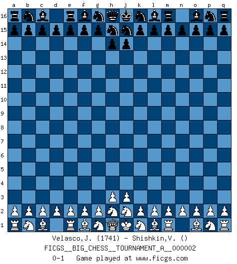 Last move : 0-1 2012 April 8 11:29:30 [Event "FICGS__BIG_CHESS__TOURNAMENT_A__000002"] [Site "FICGS"] [Date "2012.03.09"] [Round "1"] [White "Velasco,Jose Maria"] [Black "Shishkin,Viktor"] [Result "0-1"] [WhiteElo "1741"] [BlackElo ""] 0-1 This big chess game has been lost on time (started : 2012.03.09 10:2:0) Follow this game move after move (download)Chess makes man wiser and clear-sighted. (Vladimir Putin) Ich habe kein Problem mit Frauen, sondern nur mit dem Niveau ihres Schachspiels (Judith Polgar) En el tablero, la mentira e hipocresía no sobreviven mucho. (Emanuel Lasker) La victoire dans une partie d'Echecs appartient la plupart du temps à celui qui voit un peu plus loin que l'adversaire. (Lasker) Real knowledge is to know the extent of one's ignorance. (Confucius)