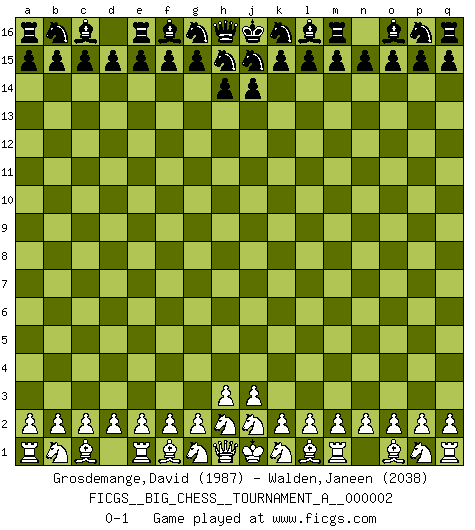 Last move : 0-1 2012 April 8 11:29:30 [Event "FICGS__BIG_CHESS__TOURNAMENT_A__000002"] [Site "FICGS"] [Date "2012.03.09"] [Round "1"] [White "Grosdemange,David"] [Black "Walden,Janeen"] [Result "0-1"] [WhiteElo "1987"] [BlackElo "2038"] 0-1 This big chess game has been lost on time (started : 2012.03.09 10:2:0) Follow this game move after move (download)When asked, -How is that you pick better moves than your opponents?, I responded: I'm very glad you asked me that, because, as it happens, there is a very simple answer. I think up my own moves, and I make my opponent think up his. (Alexander Alekhine) Schach ist gnadenlos. Du mußt bereit sein zu töten. (Nigel Short) Cada Peón es una Reina en potencia. (James Mason) Le jeu d'échecs est comme rejeté hors du temps. (Antoine de Saint-Exupéry) Pretend inferiority and encourage his arrogance. (Sun Tzu)