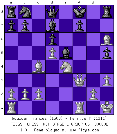 Last move : 1-0 2007 January 25 18:16:58 [Event "FICGS__CHESS__WCH_STAGE_1_GROUP_05__000002"] [Site "FICGS"] [Date "2007.01.16"] [Round "1"] [White "Gouldar,Frances"] [Black "Herr,Jeff"] [Result "1-0"] [WhiteElo "1500"] [BlackElo "1311"] 1.e4 e5 2.f4 exf4 3.Nf3 d6 4.Bc4 g5 5.O-O h5 6.d4 Nh6 7.Nc3 Be6 8.d5 Bg4 9.h3 Bd7 10.e5 Bg7 11.exd6 cxd6 12.Qe2+ Kf8 13.Ne4 g4 14.Bxf4 gxf3 15.Qxf3 Bd4+ 16.Kh1 Be5 17.Bxh6+ 1-0 KGA : Fischer defense Kingside Castling by player White (move 5) Player White won this chess game. Follow this game move after move (download)In blitz, the Knight is stronger than the Bishop. (Vlastimil Hort) Darum geht es im Schach. Einen Tag gibst du deinem Gegner eine Lektion, am nächsten Tag gibt er dir eine. (Robert James Fischer) El Ajedrez es una guerra en un tablero. El objetivo es aplastar la mente del oponente. (Bobby Fischer) Le moment que je préfère le plus dans une rencontre, c'est celui où je sens que la personnalité de l'adversaire se brise. (Robert Fischer) Begin at the beginning and go on till you come to the end; then stop. (Lewis Carrol, Alice in Wonderland)