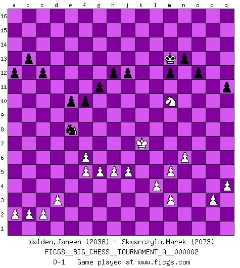 Last move : 0-1 2012 October 10 21:45:39 [Event "FICGS__BIG_CHESS__TOURNAMENT_A__000002"] [Site "FICGS"] [Date "2012.03.09"] [Round "1"] [White "Walden,Janeen"] [Black "Skwarczylo,Marek"] [Result "0-1"] [WhiteElo "2038"] [BlackElo "2073"] 1.j2-k4 p16-o14 2.h1-l4 j15-k13 3.l4-c12 h15-g13 4.c12-c15 h16-o10 5.h2-g4 o10-o2 6.m2-m4 o2-o10 7.p1-o3 b16-c14 8.c15-o4 o10-o4 9.l1-o4 e15-e13 10.n2-n4 f16-c13 11.o1-j6 d15-d14 12.e2-e4 m15-m13 13.f1-c4 l16-o13 14.b1-c3 n15-n14 15.d2-d3 o16-g9 16.c1-h6 c16-k9 17.q1-o1 m16-m14 18.k1-l3 m14-l14 19.g1-j2 e16-e14 20.j2-h4 e14-f14 21.f2-f4 q16-m16 22.j1-h2 a16-e16 23.l3-k5 k16-h15 24.m1-m3 g16-j15 25.e1-m1 g9-f8 26.m3-l3 l14-l3 27.k2-l3 f8-h6 28.k5-h6 f14-f11 29.f4-f5 e16-e14 30.a1-k1 m16-m14 31.k4-j2 m14-l14 32.k1-k4 e14-f14 33.m1-k1 k9-n12 34.k1-k2 l14-l11 35.o1-k1 f11-b11 36.c4-b3 f14-f10 37.p2-p3 j15-h13 38.n4-n5 h15-j13 39.o3-p5 l15-l14 40.q2-q4 h13-f12 41.p5-n4 f12-g10 42.n4-l5 g10-h8 43.j6-h5 b11-a11 44.c3-d5 f15-f13 45.h4-j6 h8-j6 46.h5-j6 g13-h11 47.k4-k8 b15-b14 48.k2-k6 f13-f12 49.k6-p6 o13-p14 50.d5-f6 j16-j15 51.f6-g8 f10-p10 52.p6-p10 n12-p10 53.j2-g3 p10-o9 54.g3-j4 o9-q7 55.k1-k2 c14-d12 56.j6-m3 q7-m3 57.l2-m3 g15-g13 58.g4-f6 g13-g12 59.g2-g4 g12-g11 60.h3-h4 o14-n12 61.g4-g5 d12-f13 62.k2-k7 f13-h12 63.k8-n8 a11-a8 64.n8-n7 h12-k11 65.k7-a7 a8-a7 66.n7-a7 a15-a13 67.f6-e8 l11-l10 68.a7-b7 l10-c10 69.f5-f6 k11-j9 70.g8-j9 h11-j9 71.b7-c7 c10-c7 72.e8-c7 h14-h13 73.o4-p5 h13-h12 74.b3-a4 n12-l11 75.c7-e8 c13-e11 76.h6-f7 j13-g12 77.f7-d8 g12-f10 78.d8-c10 e11-c13 79.e8-d10 p14-g6 80.c10-d8 j9-g8 81.h2-h3 j15-h14 82.a4-d7 g8-j7 83.p5-l9 j7-k9 84.d7-g4 j14-j13 85.m4-m5 k15-k14 86.l3-l4 n14-n13 87.n5-n6 o15-o14 88.g4-f5 g6-f5 89.e4-f5 h14-h13 90.d10-b11 c13-b12 91.d8-c10 b12-c11 92.c10-a11 a13-a12 93.a11-b13 c11-b12 94.b11-a9 f10-e12 95.a9-c10 b12-c13 96.l9-h6 k13-h14 97.h6-b12 h14-f15 98.b12-c13 d14-c13 99.j4-h6 k9-h10 100.l5-k7 h13-g12 101.h3-g4 f15-d14 102.b13-d14 e12-d14 103.g4-h5 l11-m9 104.h5-j6 m9-n7 105.k7-m6 b14-b13 106.j6-k7 g12-h11 107.c10-e9 c13-c12 108.e9-c10 h11-j10 109.c10-b12 j10-k9 110.b12-c14 e13-e12 111.c14-d12 l14-l13 112.d12-e14 f12-f11 113.e14-g13 n7-m9 114.g13-h15 h10-j12 115.h6-j8 f11-f10 116.j3-j4 e12-e11 117.h4-h5 e11-e10 118.j4-j5 q15-q13 119.h15-k16 m13-m12 120.k16-j14 q13-q12 121.j14-l15 m9-n11 122.m6-l8 l13-l12 123.l15-n16 n11-o13 124.l8-m10 k9-l10 125.m10-l12 l10-m11 126.j8-k10 j12-k10 127.l12-k10 m11-n12 128.k10-l12 n12-m13 129.l12-k14 m13-l14 130.k14-j16 l14-k15 131.j16-l15 k15-l14 132.l15-n14 d14-e12 133.n14-p15 o13-p15 134.n16-p15 e12-d10 135.p15-q13 o14-o13 136.q13-p15 o13-o12 137.p15-o13 q12-q11 138.o13-q12 d10-e8 139.q12-o11 l14-m13 140.o11-m10 j13-j12 0-1 Follow this game move after move (download)Chess is a forcing house where the fruits of character can ripen more fully than in life. (Edward Morgan Foster) Über Karpov: Er war und ist ein Vertreter der russischen Reaktionäre. Das steckt tief in seiner Seele, wehalb ich nicht nett mit ihm umgehen kann. (Viktor Kortschnoi) La enorme capacidad mental, en la que sin ella no puede un jugador de Ajedrez existir, es demasiado requerida por el Ajedrez al grado de que nunca podrá liberar su mente de este juego. (Albert Einstein) Le pion, dans sa simplicité, marche droit devant lui, mais lorsqu'il prend, il le fait obliquement? Ainsi l'homme, tant qu'il reste pauvre, marche dans la droiture et vit honnêtement, mais lorsqu'il recherche les honneurs, il flatte, se parjure et, par les voies obliques, cherche une position supérieure sur l'échiquier du monde. (Jean de Galles) God, you are such an idiot. - Actually, I thought I was more of a jerk. (Gregory House to Stacy Warner, House M.D.)