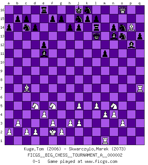 Last move : 0-1 2012 March 31 0:41:42 [Event "FICGS__BIG_CHESS__TOURNAMENT_A__000002"] [Site "FICGS"] [Date "2012.03.09"] [Round "1"] [White "Kuge,Tom"] [Black "Skwarczylo,Marek"] [Result "0-1"] [WhiteElo "2006"] [BlackElo "2073"] 1.m2-m4 j15-k13 2.j2-k4 h16-o10 3.h2-g4 e15-e13 4.b1-c3 f16-b12 5.p1-o3 d15-d14 6.k1-l3 h15-g13 7.g1-f3 p16-o14 8.e2-e4 o10-j10 9.h1-k3 m15-m13 10.b2-b3 l16-o13 11.c1-b2 n15-n14 12.f1-c4 j10-j13 13.n2-n4 o16-f8 14.j1-h2 b16-c14 15.o1-b13 k16-h15 16.c4-g8 c16-l8 17.k4-j6 a15-a14 18.b13-d11 e13-e12 19.d11-f9 o13-p12 20.f3-h4 j13-d8 21.c3-d5 g16-j15 22.l1-p5 m16-m14 23.p5-k10 m14-l14 24.l3-k5 e16-e14 25.o3-n5 e14-f14 26.m1-m3 d8-c9 27.f9-b5 c9-b8 28.b2-e5 b8-b5 29.m3-p3 b5-c6 30.j6-g5 c6-g10 31.k5-j7 l8-o11 32.g5-h7 f8-d10 33.g8-h9 g10-g12 34.f2-f3 d10-e11 35.j7-l6 l14-l7 36.g4-j5 g12-h11 37.h9-f7 m13-m12 38.f7-g6 q16-m16 39.q2-q4 a16-e16 40.q4-q5 q15-q13 41.q5-q6 m16-m14 42.p3-p7 l7-p7 43.q6-p7 f14-f12 44.p7-p8 m14-l14 45.p8-p9 f12-k12 46.k3-o7 h11-g10 47.q1-q10 o11-n10 48.o2-o3 g13-j12 49.o7-o8 k12-k10 50.k2-k4 k10-h10 51.l2-l3 n10-o11 52.e1-q1 h10-q10 53.q1-q10 g10-g13 54.a1-q1 j12-l11 55.l3-l4 b12-g7 56.e5-c7 l11-m9 57.o8-m10 p12-o13 58.m10-p13 o13-p14 59.l4-l5 o11-p12 60.h7-k8 m9-k8 61.g6-p14 k8-l6 62.p14-o15 l6-j5 63.k4-j5 m12-m11 64.p13-p15 k13-m14 65.o15-p14 m14-o13 66.p15-o16 h15-k16 67.h4-f5 g7-n13 68.q10-q7 g13-p5 69.q1-m1 p5-p2 70.h2-g3 p2-p9 71.g3-f2 p9-l13 0-1 Follow this game move after move (download)Chess is not like life... it has rules ! (Mark Pasternak) Wenn Capablanka heute auf der Schachbühne erscheinen würde, hätte er ein halbes Jahr gebraucht um sich die Schachtheorie anzueignen. Und dann hätte er alles und jeden besiegt. (Mikhail Moiseyevich Botvinik) La vida es como un juego de Ajedrez, cambiando con cada movimiento. (Proverbio Chino) Psychologiquement, tu dois avoir confiance en toi même, mais cette confiance doit être basée sur des faits. (Robert Fischer) Only sick music makes money today. (Friedrich Nietzsche)