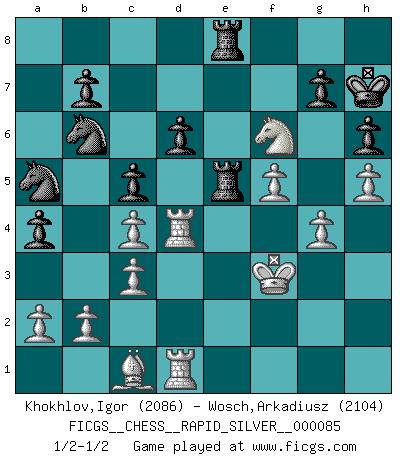 Last move : 1/2-1/2 2012 August 4 0:42:21 [Event "FICGS__CHESS__RAPID_SILVER__000085"] [Site "FICGS"] [Date "2012.03.09"] [Round "2"] [White "Khokhlov,Igor"] [Black "Wosch,Arkadiusz"] [Result "1/2-1/2"] [WhiteElo "2086"] [BlackElo "2104"] 1.c4 Nf6 2.Nc3 e5 3.Nf3 Nc6 4.g3 Bb4 5.Bg2 O-O 6.O-O e4 7.Ne1 Bxc3 8.dxc3 h6 9.Nc2 Re8 10.Ne3 d6 11.Qc2 a5 12.f4 exf3 13.exf3 Bd7 14.Bd2 Qb8 15.Rae1 a4 16.h3 Qa7 17.Kh2 Qa6 18.f4 Ne7 19.Rf2 Bc6 20.Bc1 Bxg2 21.Rxg2 Qc6 22.Rge2 Kf8 23.Qd3 Qf3 24.Rf1 Qe4 25.Qxe4 Nxe4 26.Rc2 Nc6 27.Kg2 Nc5 28.Kf3 Rac8 29.Rd1 Na5 30.g4 Kg8 31.Rd4 Nd7 32.h4 Nb6 33.Rg2 Kh7 34.h5 f6 35.Rg1 Re6 36.Rgd1 Rce8 37.f5 Re5 38.Nd5 c5 39.Nxf6+ 1/2-1/2 English Opening Kingside Castling by player Black (move 5) Kingside Castling by player White (move 6) This chess game ended in a draw. Follow this game move after move (download)Chess is a more highly symbolic game, but the aggressions are therefore even more frankly represented in the play. It probably began as a war game; that is, the representation of a miniature battle between the forces of two kingdoms. (Karl Meninger) Kostenjuk hat keinen Sexappeal. (Loek van Wely) Bobby Fischer es el jugador de Ajedrez mas grande que jamás haya existido. (Ken Smith) Je fais ceci parce que dans cinquante coups j'obtiendrai cela; je m'appelle Mikhail Moisevitch Botvinnik. (Botvinnik) Experiences are the keys to life. (Daniel Parmet)
