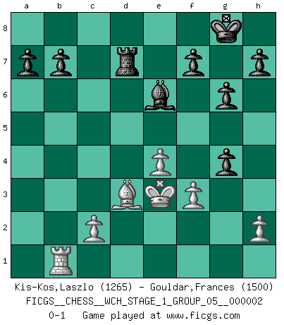 Last move : 0-1 2007 February 6 8:24:49 [Event "FICGS__CHESS__WCH_STAGE_1_GROUP_05__000002"] [Site "FICGS"] [Date "2007.01.16"] [Round "1"] [White "Kis-Kos,Laszlo"] [Black "Gouldar,Frances"] [Result "0-1"] [WhiteElo "1265"] [BlackElo "1500"] 1.e4 c5 2.Nf3 d6 3.d4 cxd4 4.Nxd4 Nf6 5.Nc3 g6 6.Be3 Bg7 7.f3 O-O 8.Qd2 Nc6 9.O-O-O Nxd4 10.Bxd4 Qa5 11.Kb1 Be6 12.Nd5 Qd8 13.Nxf6+ Bxf6 14.Bxf6 exf6 15.Qxd6 Qa5 16.Be2 Qxa2+ 17.Kc1 Qa1+ 18.Kd2 Qxb2 19.Rb1 Qxb1 20.Rxb1 Rad8 21.Qxd8 Rxd8+ 22.Ke3 Rd7 23.g4 f5 24.Bd3 fxg4 0-1 Sicilian : Dragon, Yugoslav attack, 7...O-O Kingside Castling by player Black (move 7) Queenside Castling by player White (move 9) Player Black won this chess game. Follow this game move after move (download)Avoid the crowd. Do your own thinking independently. Be the Chess player, not the Chess piece. (Ralph Charell) Modernes Schach erfordert enorme Anspannung. Es ist für einen normalen Menschen unmöglich das auszuhalten. (Viktor Kortschnoi) Con el tiempo, empecé a progresar en partidas decisivas. Tal vez porque me di cuenta de una simple verdad: no solo estaba yo nervioso sino también mi oponente. (Mikhail Tal) Les écrivains ont utilisé les échecs pour analyser les côtés extrêmes de la nature humaine. Dans ce cadre, les échecs offrent un champ d'expérimentation idéal. Mais on pourrait faire la même chose avec la peinture. Et là, en vous référant à Van Gogh, vous ne tirerez pas de conclusion définitive sur les peintres. (Gary Kasparov) As the days dwindle down... to a precious few. (Maxwell Anderson)