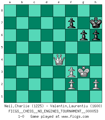 Last move : 1-0 2012 July 28 7:48:10 [Event "FICGS__CHESS__NO_ENGINES_TOURNAMENT__000053"] [Site "FICGS"] [Date "2012.03.10"] [Round "1"] [White "Neil,Charlie"] [Black "Valentin,Laurentiu"] [Result "1-0"] [WhiteElo "1225"] [BlackElo "1600"] 1.e4 c5 2.Nc3 e6 3.Nf3 d5 4.exd5 exd5 5.d4 Nf6 6.Bg5 Be7 7.dxc5 Bxc5 8.Bd3 O-O 9.O-O Be6 10.a3 Nbd7 11.Qe2 Re8 12.Rae1 Qc7 13.b4 Bxb4 14.axb4 Qxc3 15.b5 Bg4 16.Qd1 h6 17.Be3 d4 18.Bxd4 Qxd4 19.Bh7+ Kxh7 20.Qxd4 Bxf3 21.gxf3 Red8 22.Re7 Kg8 23.Rd1 Rdc8 24.Rxd7 Nxd7 25.Qxd7 Rxc2 26.Qf5 Rac8 27.Rd7 Rc1+ 28.Kg2 Rf8 29.Rxb7 Ra1 30.Qc5 a5 31.b6 a4 32.Ra7 a3 33.Rxa3 Rd1 34.b7 R1d8 35.Qc7 Rb8 36.Qxb8 Rxb8 37.Ra8 Rxa8 38.bxa8Q+ Kh7 39.Qe4+ g6 40.Kg3 1-0 Sicilian : Closed Kingside Castling by player Black (move 8) Kingside Castling by player White (move 9) 10 pieces endgame at move 37 : White KPPPP , Black KRPPP WHITE : King + 4 Pawns BLACK : King + 1 Rook 3 Pawns Promotion Queen by player White (move 38) 9 pieces endgame at move 38 : White KQPPP , Black KPPP WHITE : King + 1 Queen 3 Pawns BLACK : King + 3 Pawns Player White won this chess game. Follow this game move after move (download)To avoid losing a piece, many a person has lost the game. (Savielly Tartakover) Ich tröste mich mit dem Vergnügen, daß Schachfans, Zuschauer und Leser glücklich sind, wenn ein Großmeister etwas riskiert, statt nur Klötzchen zu schieben. (Mikhail Nekhemyevich Tal) Muchos se han convertido en Maestros de Ajedrez, nadie se ha convertido en el Maestro del Ajedrez. (Siegbert Tarrasch) C'est une question de caractère, Beaucoup de gens perdent leur motivation très vite. D'autres, ils sont rares, peuvent la conserver très longtemps. J'aime les échecs, encore aujourd'hui je suis heureux d'analyser des parties. J'aime toujours gagner, je déteste encore perdre. Bien jouer est important pour mon intégrité intellectuelle et morale. Et puis les échecs vivent en ce moment une période historique grâce à Internet. Ils se développent dans les systèmes éducatifs à travers le monde. Ils sortent de leur ghetto, et c'est mon rôle de mener à bien cette révolution. (Gary Kasparov) The large trees attract high winds. (Chinese proverb)