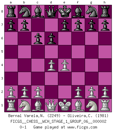 Last move : 0-1 2007 March 2 12:15:49 [Event "FICGS__CHESS__WCH_STAGE_1_GROUP_06__000002"] [Site "FICGS"] [Date "2007.01.16"] [Round "1"] [White "Bernal Varela,Nelson"] [Black "Oliveira,Carlos"] [Result "0-1"] [WhiteElo "2249"] [BlackElo "1981"] 1.e4 d6 2.d4 c6 0-1 This chess game has been lost on time (started : 2007.01.16 15:17:11) King's pawn Opening Player Black won this chess game. Follow this game move after move (download)The mistakes are there, waiting to be made. (Savielly Tartakower) Wir irren allesamt, nur jeder irrt anders. (Georg Christoph Lichtenberg) La captura del Rey enemigo es la finalidad pero no el primer objetivo de la partida. (William Steinitz) Toutes les manuvres exécutées sur une colonne ouverte ont pour but ultime l'intrusion définitive sur la septième ou la huitième rangée, en plein cur de la position ennemie. (Aaron Nimzovitch) There's no money in correspondence chess. (John Knudsen)