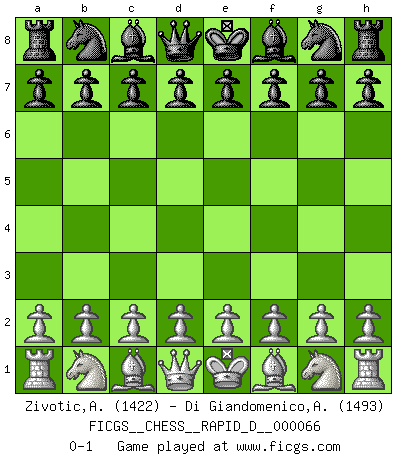 Last move : 0-1 2012 April 11 23:34:59 [Event "FICGS__CHESS__RAPID_D__000066"] [Site "FICGS"] [Date "2012.03.12"] [Round "1"] [White "Zivotic,Aleksandar"] [Black "Di Giandomenico,Alfonso"] [Result "0-1"] [WhiteElo "1422"] [BlackElo "1493"] 0-1 This chess game has been lost on time (started : 2012.03.12 14:12:44) Player Black won this chess game. Follow this game move after move (download)Bobby Fischer's current state of mind is indeed a tragedy. One of the world's greatest Chess players - the pride and sorrow of American Chess. (Frank Brady) Dein Körper muss in Topform sein. Dein Schach verfällt, wenn dein Körper verfällt. Der Körper kann nicht vom Geist getrennt werden. (Robert James Fischer) Dios mío, Bobby Fischer juega tan simple. (Alexei Suetin) Les Echecs sont affaire de jugement sensible. Savoir quand frapper et quand esquiver. (Fischer) . 'gn is not allowed in chess unless n is an integer between 1 and 8 inclusive, where 1 and 8 are to interpreted as the standard numerals standing for integers in the ordered real-closed field R, with the *canonical* ordering. (As opposed to, say, an integer in the domain Z[2+i*sqrt(5)] or an integer in some exotic Grothendieck topos). (Normajean Yates)