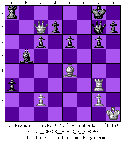 Last move : 0-1 2012 May 15 19:43:19 [Event "FICGS__CHESS__RAPID_D__000066"] [Site "FICGS"] [Date "2012.03.12"] [Round "1"] [White "Di Giandomenico,Alfonso"] [Black "Joubert,Hennie"] [Result "0-1"] [WhiteElo "1493"] [BlackElo "1415"] 1.e4 c5 2.Nf3 e6 3.d4 cxd4 4.Nxd4 Nf6 5.Nc3 Qb6 6.Be2 Bc5 7.Be3 Nc6 8.Nxc6 Bxe3 9.O-O bxc6 10.fxe3 Qxe3+ 11.Kh1 Nxe4 12.Nxe4 Qxe4 13.Bd3 Qd5 14.Qg4 O-O 15.Rad1 Qxa2 16.Rf3 Qxb2 17.Rh3 g6 18.Rg3 a5 19.h4 Qb4 20.Qg5 Qb2 21.h5 Qg7 22.hxg6 fxg6 23.Re1 Ba6 24.Be4 Rf1+ 25.Rxf1 Bxf1 26.Qc5 Bb5 27.Qd6 a4 28.Qc7 a3 0-1 Sicilian : Anderssen variation Kingside Castling by player White (move 9) Kingside Castling by player Black (move 14) Player Black won this chess game. Follow this game move after move (download)Do you realize Fischer almost never has any bad pieces? He exchanges them, and the bad pieces remain with his opponents. (Yuri Balashov) Die Elozahlen sind sehr schlecht für das Schach. Jetzt ist Schach eine Sportindustrie, die darauf zielt Elopunkte zu machen. (Miguel Najdorf) Bendita sea la memoria de aquel que dio al mundo este juego inmortal. (A. G. Gardiner) Même un GMI sait rarement calculer sur plus de cinq coups une attaque à sacrifices. (Rudolf Spielmann) Real knowledge is to know the extent of one's ignorance. (Confucius)