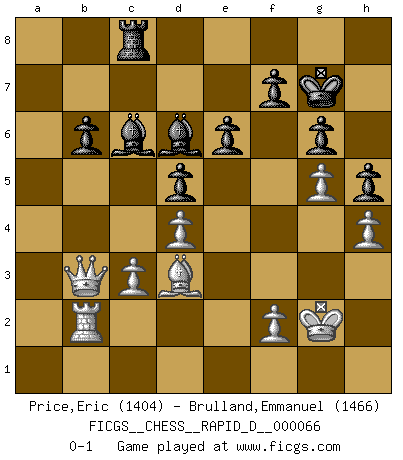 Last move : 0-1 2012 June 6 15:22:44 [Event "FICGS__CHESS__RAPID_D__000066"] [Site "FICGS"] [Date "2012.03.12"] [Round "1"] [White "Price,Eric"] [Black "Brulland,Emmanuel"] [Result "0-1"] [WhiteElo "1404"] [BlackElo "1466"] 1.e4 c6 2.d4 d5 3.Nc3 e6 4.exd5 cxd5 5.Nf3 Nf6 6.Bd3 Be7 7.O-O O-O 8.Re1 Re8 9.Bf4 Nbd7 10.Qd2 Bf8 11.h3 g6 12.Nb5 Nb6 13.Nc7 Bd7 14.Nxe8 Bxe8 15.Ne5 Bg7 16.b3 Rc8 17.Re2 a6 18.a4 Nbd7 19.Qb4 Nxe5 20.Bxe5 Qc7 21.Bxc7 Rxc7 22.Qb6 Rd7 23.b4 Bf8 24.b5 axb5 25.Bxb5 Re7 26.Bd3 Bc6 27.g4 Rd7 28.a5 Bd6 29.a6 Bc7 30.a7 Bxb6 31.a8Q+ Kg7 32.g5 Ng8 33.c3 Ne7 34.Rb2 Bc7 35.Qa3 Bd6 36.Qb3 Rc7 37.Ra8 Nc8 38.Kg2 h5 39.h4 b6 40.Rxc8 Rxc8 0-1 This chess game has been lost on time (started : 2012.03.12 14:12:44) Caro-Kann defense Kingside Castling by player White (move 7) Kingside Castling by player Black (move 7) Promotion Queen by player White (move 31) Player Black won this chess game. Follow this game move after move (download)The battle for the ultimate truth will never be won. And that's why Chess is so fascinating. (Hans Kmoch) Die starken Figuren des Gegners muss man abtauschen. (José Raúl Capablanca) Ciertamente el estado mental actual de Bobby Fischer es una tragedia. Uno de los mas grandes jugadores de Ajedrez del mundo -el orgullo y pena del Ajedrez Americano. (Frank Brady) Botvinnik disait en comparant les échecs à la musique: Il existe une science dont le but est l'étude de l'acoustique et des sons. Mais il y a aussi un art qui se sert de l'océan des sons : c'est la musique. De toute évidence, il en est de même pour la pensée. La logique est l'étude des lois de la réflexion et les échecs reflètent, en tant qu'art, le côté logique de la réflexion, sous la forme d'images artistiques... Extrait de Fischer - Spassky, Reykjavik 1972 par Alexander & F. Wyndham (Ed. Solar), p 37. A good programmer is someone who always looks both ways before crossing a one-way street. (Doug Linder)