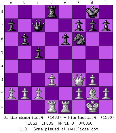 Last move : 1-0 2012 April 22 4:37:6 [Event "FICGS__CHESS__RAPID_D__000066"] [Site "FICGS"] [Date "2012.03.12"] [Round "1"] [White "Di Giandomenico,Alfonso"] [Black "Piantadosi,Angelo"] [Result "1-0"] [WhiteElo "1493"] [BlackElo "1390"] 1.e4 e6 2.d3 d5 3.Nd2 dxe4 4.Nxe4 Nd7 5.Nf3 Ngf6 6.Nxf6+ Nxf6 7.g3 Be7 8.Bg2 O-O 9.O-O c5 10.Re1 b6 11.Ne5 Bb7 12.Bxb7 Rb8 13.Bg2 Nd7 14.Nc6 Qe8 15.Nxb8 Qxb8 16.Bd2 Rd8 17.Bc3 Bf6 18.Bxf6 Nxf6 19.Qf3 Qc7 20.Rad1 1-0 French : King's Indian attack Kingside Castling by player Black (move 8) Kingside Castling by player White (move 9) Player White won this chess game. Follow this game move after move (download)A win by an unsound combination, however showy, fills me with artistic horror. (Wilhelm Steinitz) Es macht mich traurig, wenn ich sehe, dass Golfprofis mehr verdienen als Schachsportler. Obwohl ich davon überzeugt bin, dass wir Schachspieler viel härter trainieren müssen als die Golfer. (Alexandra Kosteniuk) El Ajedrez es un regaderazo frío para la mente. (Sir John Simon) En blitz, le Cavalier l'emporte sur le Fou. (Vlastimil Hort) I would love to change the world, but they won't give me the source code. (Unknown)