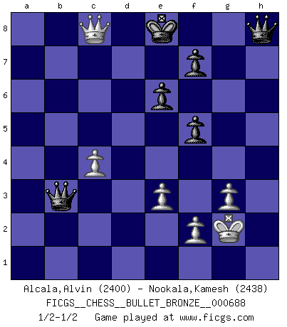 Last move : 1/2-1/2 2012 March 12 17:9:54 [Event "FICGS__CHESS__BULLET_BRONZE__000688"] [Site "FICGS"] [Date "2012.03.12"] [Round "1"] [White "Alcala,Alvin"] [Black "Nookala,Kamesh"] [Result "1/2-1/2"] [WhiteElo "2400"] [BlackElo "2438"] 1.c4 e6 2.Nf3 d5 3.d4 Nf6 4.g3 Be7 5.Bg2 O-O 6.O-O dxc4 7.Ne5 Nc6 8.Bxc6 bxc6 9.Nxc6 Qe8 10.Nxe7+ Qxe7 11.Na3 Rd8 12.Qc2 Ba6 13.Nxc4 c5 14.dxc5 Qxc5 15.b3 Bxc4 16.Bb2 Rac8 17.Rac1 Qa5 18.Bxf6 gxf6 19.bxc4 Rd2 20.Qe4 Rxa2 21.Rfd1 Rd2 22.e3 Qd8 23.Kg2 a5 24.Qg4+ Kf8 25.Qh5 a4 26.Qxh7 Rxd1 27.Rxd1 Qxd1 28.Qh8+ Ke7 29.Qxc8 Qb3 30.h4 a3 31.Qc7+ Ke8 32.h5 a2 33.h6 a1Q 34.h7 f5 35.h8Q+ Qxh8 36.Qc8+ 1/2-1/2 English Opening : Agincourt variation Kingside Castling by player Black (move 5) Kingside Castling by player White (move 6) Promotion Queen by player Black (move 33) Promotion Queen by player White (move 35) This chess game ended in a draw. Follow this game move after move (download)Chess is like war on a board. (Bobby Fischer) Der Verteidiger gebe der Gewalt nach, aber nur der Gewalt. Er schaffe sich nicht freiwillig, etwa aus Blindheit oder aus Schrecken, irgendwelche Schwächen. Er lasse sich nicht bluffen. (Emanuel Lasker) Fischer era un maestro de claridad y un Rey del posicionamiento astuto. Sus oponentes podían ver hacia donde se dirigía pero eran impotentes para detenerlo. (Bruce Pandolfini) Le plus grand jeu de l'esprit jamais inventé, plus vous l'apprenez, plus vous y prenez du plaisir. (Garry Kasparov) It is the aim of the modern school, not to treat every position according to one general law, but according to the principle inherent in the position. (Richard Reti)