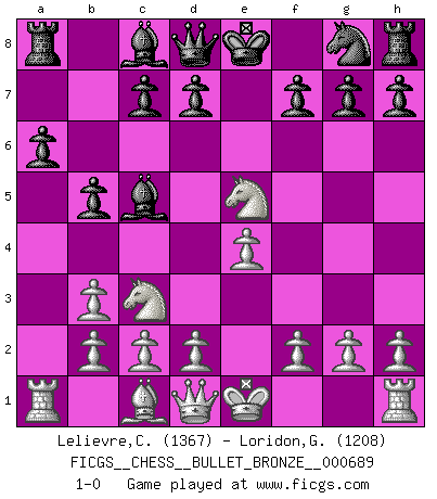 Last move : 1-0 2012 March 12 18:4:13 [Event "FICGS__CHESS__BULLET_BRONZE__000689"] [Site "FICGS"] [Date "2012.03.12"] [Round "1"] [White "Lelievre,Clement"] [Black "Loridon,Geoffroy"] [Result "1-0"] [WhiteElo "1367"] [BlackElo "1208"] 1.e4 e5 2.Nf3 Nc6 3.Bb5 a6 4.Ba4 b5 5.Bb3 Bc5 6.Nc3 Nd4 7.Nxe5 Nxb3 8.axb3 1-0 This chess game has been lost on time (started : 2012.03.12 17:54:34) Ruy Lopez : Graz variation Player White won this chess game. Follow this game move after move (download)The combination player thinks forward; he starts from the given position, and tries the forceful moves in his mind. (Emanuel Lasker) In der Schule lernt man nichts. Es ist nur Zeitverschwendung. (Robert James Fischer) Combinaciones deslumbrantes son para la mayoría, mover madera es para los pocos. (Georg Kieninger) J'apprécie les joueurs d'est-indienne, c'est grâce à eux que je nourris ma famille depuis tant d'années. (Petrosian) Always be a first-rate version of yourself, instead of a second-rate version of somebody else. (Judy Garland)