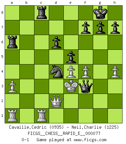 Last move : 0-1 2012 April 15 16:31:7 [Event "FICGS__CHESS__RAPID_E__000077"] [Site "FICGS"] [Date "2012.03.13"] [Round "1"] [White "Cavaille,Cedric"] [Black "Neil,Charlie"] [Result "0-1"] [WhiteElo "0935"] [BlackElo "1225"] 1.e4 c5 2.Nf3 Nc6 3.Bc4 e6 4.a3 a6 5.O-O b5 6.Be2 Bb7 7.c3 Nge7 8.b4 c4 9.d3 cxd3 10.Bxd3 e5 11.Be3 Ng6 12.c4 bxc4 13.Bxc4 Be7 14.Qc1 d6 15.Bg5 O-O 16.Bxe7 Qxe7 17.b5 axb5 18.Bxb5 Rfc8 19.Nc3 Ba6 20.Bxa6 Rxa6 21.Nd5 Qe6 22.Nb4 Nxb4 23.Qd2 Nc6 24.Rfc1 Nf4 25.g3 Ng6 26.h4 Qg4 27.Kg2 Nf4+ 28.Kf1 Qxf3 29.gxf4 Qh1+ 30.Ke2 Nd4+ 31.Ke3 Qh3+ 32.f3 Qxf3+ 0-1 Sicilian defense Kingside Castling by player White (move 5) Kingside Castling by player Black (move 15) Player Black won this chess game. Follow this game move after move (download)The chessboard is the world, the pieces are the phenomena of the Universe, the rules of the game are what we call the laws of Nature and the player on the other side is hidden from us. (Thomas Huxley) Im Spitzenschach von heute geht es nur um Vorbereitung, um tiefgründige, sorgfältige Eröffnungsvorbereitung. (Nigel Short) El Ajedrez es un invernadero donde los frutos del carácter pueden madurar mas completamente que en la vida. (Edward Morgan Foster) La tactique est l'élément le plus important du milieu de jeu. (Siegbert Tarrasch) Faith : not wanting to know what is true. (Friedrich Nietzsche)
