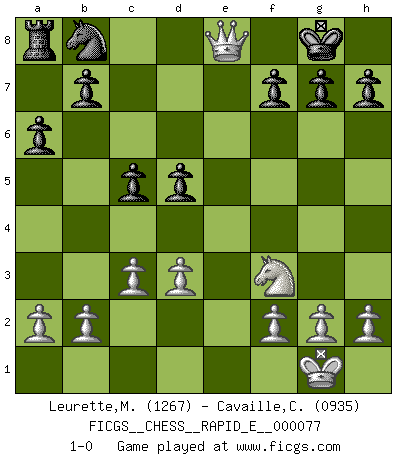 Last move : 1-0 2012 March 13 22:7:37 [Event "FICGS__CHESS__RAPID_E__000077"] [Site "FICGS"] [Date "2012.03.13"] [Round "1"] [White "Leurette,Marc-Antoine"] [Black "Cavaille,Cedric"] [Result "1-0"] [WhiteElo "1267"] [BlackElo "0935"] 1.e4 c5 2.Nc3 d6 3.Bb5+ Bd7 4.Bxd7+ Qxd7 5.Nf3 e6 6.d3 Nf6 7.O-O Be7 8.Bg5 O-O 9.e5 dxe5 10.Nxe5 Qd6 11.Nf3 Nd5 12.Bxe7 Qxe7 13.Nxd5 exd5 14.Re1 Qd8 15.c3 Re8 16.Qa4 Rxe1+ 17.Rxe1 a6 18.Re8+ Qxe8 19.Qxe8+ 1-0 Sicilian : Closed Kingside Castling by player White (move 7) Kingside Castling by player Black (move 8) Player White won this chess game. Follow this game move after move (download)If a ruler does not understand Chess, how can he rule over a kingdom ? (King Khusros II) Die Idee von Capablanca, Schach als Fach in den Schulen zu lehren, ist großartig. (Fidel Castro) Yo tuve un dolor de muelas en la primer partida. En el segundo juego, tuve un dolor de cabeza. En el tercero, tuve un ataque de reumatísmo. En la cuarta partida, no me sentía muy bien. ¿Y en el quinto juego? Bueno, ¿que acaso uno tiene que ganar todos los juegos?. (Siegbert Tarrasch) D'abord les bases : Jouez et étudiez, puis étudiez et jouez, ensuite jouez et étudiez, puis étudiez et jouez. Deuxièmement : Donnez toujours le meilleur de vous-même ! (Ken Smith) The bottom line is always the bottom line. (Johann Piek)