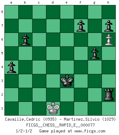Last move : 1/2-1/2 2012 May 25 18:13:49 [Event "FICGS__CHESS__RAPID_E__000077"] [Site "FICGS"] [Date "2012.03.13"] [Round "1"] [White "Cavaille,Cedric"] [Black "Martinez,Silvio"] [Result "1/2-1/2"] [WhiteElo "0935"] [BlackElo "1029"] 1.e4 e5 2.Nf3 Nc6 3.Bc4 Nf6 4.d4 exd4 5.Nxd4 Nxd4 6.Qxd4 b6 7.Nc3 c5 8.Qe3 Be7 9.O-O O-O 10.a3 Bb7 11.Bd3 Re8 12.b4 cxb4 13.axb4 Bxb4 14.Bd2 d5 15.Rfb1 Bc5 16.Qg3 Bd4 17.exd5 Nxd5 18.Nxd5 Bxa1 19.Rxa1 Bxd5 20.Bc3 g6 21.f4 a5 22.Qg5 Qxg5 23.fxg5 Rac8 24.Bd4 Re6 25.c4 Bxc4 26.Bxc4 Rxc4 27.Bf2 Rg4 28.Re1 Rxe1+ 29.Bxe1 Rxg5 30.Bd2 Rd5 31.Bf4 a4 32.Bd2 Rxd2 33.h4 Kg7 34.Kh2 Kh6 35.Kh3 Kh5 36.g3 Rd3 37.Kg2 Kg4 38.Kh2 Rd2+ 39.Kg1 Kxg3 40.Kf1 Kf3 41.Ke1 Rh2 42.Kd1 Ke3 43.h5 g5 44.h6 Kd3 45.Ke1 Ke3 46.Kd1 Ra2 47.Kc1 Rh2 48.Kd1 1/2-1/2 Two knights defense Kingside Castling by player White (move 9) Kingside Castling by player Black (move 9) 10 pieces endgame at move 32 : White KPP , Black KRPPPPP WHITE : King + 2 Pawns BLACK : King + 1 Rook 5 Pawns 9 pieces endgame at move 39 : White KP , Black KRPPPPP WHITE : King + 1 Pawn BLACK : King + 1 Rook 5 Pawns This chess game ended in a draw. Follow this game move after move (download)An attack on the wing should be met by play in the center. (Nimzovitch) Frage: Gibt es etwas was Sie mehr lieben als Autobahnen ohne Tempobegrenzungen? - Antwort: Deutsche Frauen ohne Tempobegrenzungen. (Loek van Wely) Las leyes del Ajedrez no permiten una libre elección: tienes que mover quieras o no. (Emanuel Lasker) Un journaliste : 'Vous préférez avoir une dame de plus sur l'échiquier ou au lit ?' Boris Spassky : 'Ca dépend de la position.' Question: Is 'This statement is paradoxical' a paradoxical statement ? Or is it a meta-paradox ? (Normajean Yates)