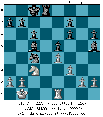 Last move : 0-1 2012 April 4 21:51:55 [Event "FICGS__CHESS__RAPID_E__000077"] [Site "FICGS"] [Date "2012.03.13"] [Round "1"] [White "Neil,Charlie"] [Black "Leurette,Marc-Antoine"] [Result "0-1"] [WhiteElo "1225"] [BlackElo "1267"] 1.d4 d5 2.c4 dxc4 3.Nc3 Nf6 4.Bg5 h6 5.Bxf6 gxf6 6.Qa4+ Nc6 7.Qxc4 Qxd4 8.Qxd4 Nxd4 9.O-O-O e5 10.e3 Nc6 11.Bb5 Bd7 12.e4 O-O-O 13.Nf3 Bc5 14.Rhf1 Bg4 15.Rxd8+ Rxd8 16.Nh4 Nd4 17.f3 Bh5 18.Bc4 c6 19.Nf5 Nxf5 20.Kb1 Ne3 21.Re1 Nxc4 0-1 Queen's gambit accepted Queenside Castling by player White (move 9) Queenside Castling by player Black (move 12) Player Black won this chess game. Follow this game move after move (download)Bobby Fischer is the greatest Chess player who has ever lived. (Ken Smith) Das Schachspiel hat wie die Liebe, die Musik, die Fähigkeit, den Menschen glücklich zu machen. Ich habe ein leises Gefühl des Bedauerns für jeden, der das Schachspiel nicht kennt, so wie ich jeden bedaure, der die Liebe nicht kennt. (Siegbert Tarrasch) El sobresalir en el Ajedrez es un signo de una mente intrigante. (Sir Arthur Conan Doyle) Toutes choses étant égales, c'est la conviction qui gagne. Alliée à une volonté de vaincre, elle sert de détonateur, suscite des idées, disperse les doutes et aide à penser clairement. (Robert Fischer) Nowadays, anyone who cannot speak English and is incapable of using the Internet is regarded as backward. (Al-Waleed bin Talal)