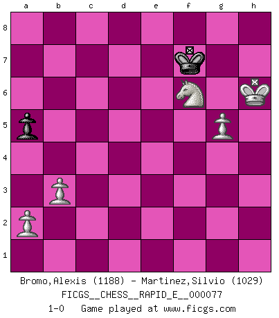 Last move : 1-0 2012 June 6 3:23:12 [Event "FICGS__CHESS__RAPID_E__000077"] [Site "FICGS"] [Date "2012.03.13"] [Round "1"] [White "Bromo,Alexis"] [Black "Martinez,Silvio"] [Result "1-0"] [WhiteElo "1188"] [BlackElo "1029"] 1.d4 d5 2.c4 dxc4 3.Nc3 Nf6 4.Nf3 Nc6 5.e4 e5 6.d5 Na5 7.Qa4+ Qd7 8.Qxa5 b6 9.Qb5 Qxb5 10.Nxb5 Bd6 11.Nxd6+ cxd6 12.Bxc4 O-O 13.Bg5 Nxe4 14.O-O h6 15.Bh4 g5 16.Bg3 Nxg3 17.fxg3 Bf5 18.Nd2 Rab8 19.Rxf5 Kg7 20.Ne4 b5 21.Nxd6 bxc4 22.Nxc4 f6 23.b3 Kg6 24.Raf1 Rb5 25.Ne3 e4 26.Ng4 h5 27.Ne5+ Kh7 28.h4 gxh4 29.Rxh5+ Kg8 30.Nd7 Rf7 31.Nxf6+ Kg7 32.Rh7+ Kg6 33.Rxf7 Kxf7 34.Nxe4 Kg6 35.gxh4 Rxd5 36.Rf6+ Kh5 37.Kh2 Kxh4 38.Rh6+ Rh5 39.Rxh5+ Kxh5 40.Kh3 a5 41.g4+ Kg6 42.Kh4 Kh6 43.g5+ Kg6 44.Nf6 Kg7 45.Kh5 Kf7 46.Kh6 1-0 This chess game has been lost on time (started : 2012.03.13 10:42:1) Queen's gambit accepted Kingside Castling by player Black (move 12) Kingside Castling by player White (move 14) 10 pieces endgame at move 35 : White KRNPPPP , Black KRP WHITE : King + 1 Rook 1 Knight 4 Pawns BLACK : King + 1 Rook 1 Pawn 9 pieces endgame at move 37 : White KRNPPP , Black KRP WHITE : King + 1 Rook 1 Knight 3 Pawns BLACK : King + 1 Rook 1 Pawn 8 pieces endgame at move 39 : White KRNPPP , Black KP WHITE : King + 1 Rook 1 Knight 3 Pawns BLACK : King + 1 Pawn 7 pieces endgame at move 39 : White KNPPP , Black KP WHITE : King + 1 Knight 3 Pawns BLACK : King + 1 Pawn Player White won this chess game. Follow this game move after move (download)Live, lose, and learn, by observing your opponent how to win. (Amber Steenbock) Die Jungen erwarten, dass Opa einfach umfällt. Dann aber kann Opa fünf Stunden lang Schach spielen und die jungen Gegner an die Wand drücken. (Viktor Kortschnoi) Un mal plan es mejor que no tener ningún plan. (Frank Marshall) Le joueur d'Echecs qui veut atteindre le top est obligé de développer son propre credo créatif. Alexeï Stepanovicth Souétine. Il est facile d'écrire des livres ! Ce qui est difficile, c'est de jouer ! (Alexeï Stepanovicth Souétine) I fear not the man who has practiced 10,000 kicks once, but I fear the man who has practiced one kick 10,000 times. (Bruce Lee)