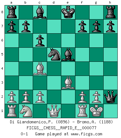 Last move : 0-1 2012 March 27 16:42:53 [Event "FICGS__CHESS__RAPID_E__000077"] [Site "FICGS"] [Date "2012.03.13"] [Round "1"] [White "Di Giandomenico,Pierino"] [Black "Bromo,Alexis"] [Result "0-1"] [WhiteElo "0896"] [BlackElo "1188"] 1.e4 e5 2.d3 Nf6 3.Be2 Nc6 4.Nf3 Bc5 5.O-O d5 6.Nxe5 Nxe5 7.exd5 Nxd5 8.d4 Bd6 9.dxe5 Bxe5 10.Bb5+ c6 11.Bc4 Qh4 12.Be3 Qxh2+ 0-1 Variation Indian Opening : Indian Opening Kingside Castling by player White (move 5) Player Black won this chess game. Follow this game move after move (download)Combinations have always been the most intriguing aspect of Chess. The masters look for them, the public applauds them, the critics praise them. It is because combinations are possible that Chess is more than a lifeless mathematical exercise. They are the poetry of the game; they are to Chess what melody is to music. They represent the triumph of mind over matter. (Reuben Fine) Was ist der Unterschied zwischen einem Strassenarbeiter und einem Schachspieler? --Der Schachspieler bewegt sich ab und zu. (Anonymous) Dios mío, Bobby Fischer juega tan simple. (Alexei Suetin) Les Echecs mettent en conflit, non pas deux intelligences, mais deux volontés. (Lasker) Work expands to fill the time available. (C. Northcote Parkinson, in Parkinson's Laws)