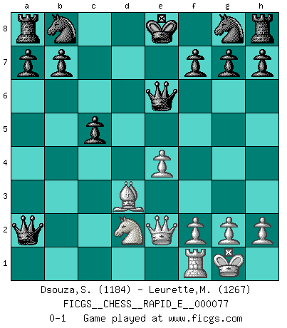 Last move : 0-1 2012 May 1 12:40:35 [Event "FICGS__CHESS__RAPID_E__000077"] [Site "FICGS"] [Date "2012.03.13"] [Round "1"] [White "Dsouza,Stanislaus"] [Black "Leurette,Marc-Antoine"] [Result "0-1"] [WhiteElo "1184"] [BlackElo "1267"] 1.e4 e5 2.d4 exd4 3.Bd3 Bb4+ 4.c3 dxc3 5.Nf3 cxb2 6.Bd2 bxa1Q 7.Bxb4 Qxa2 8.O-O d6 9.Nbd2 Be6 10.Nd4 Qd7 11.Qe2 c5 12.Bxc5 dxc5 13.Nxe6 Qd7xe6 0-1 This chess game has been lost on time (started : 2012.03.13 10:42:1) Centre game Promotion Queen by player Black (move 6) Kingside Castling by player White (move 8) Player Black won this chess game. Follow this game move after move (download)Though most people love to look at the games of the great attacking masters, some of the most successful players in history have been the quiet positional players. They slowly grind you down by taking away your space, tying up your pieces, and leaving you with virtually nothing to do ! (Yasser Seirawan) Wer der Ansicht ist, daß alle Schachspieler verrückt sind, wird durch Studium des Lebens von Emil Josef Diemer nicht auf andere Gedanken kommen. (Hans Ree) El Ajedrez es un invernadero donde los frutos del carácter pueden madurar mas completamente que en la vida. (Edward Morgan Foster) Echiquier : carré parfait, comme la Jérusalem nouvelle décrite par l'auteur de l'Apocalypse, huit cases sur huit, exaltation du chiffre 4, symbole du cosmos aux quatre horizons... où le noir et le blanc, l'ombre et la lumière, le mal et le bien s'entremêlent et se conjuguent. (Robert Couffignal, Le Gambit du poète) God is an atheist. (Unknown)