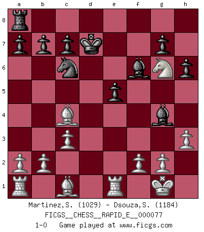 Last move : 1-0 2012 May 16 13:16:31 [Event "FICGS__CHESS__RAPID_E__000077"] [Site "FICGS"] [Date "2012.03.13"] [Round "1"] [White "Martinez,Silvio"] [Black "Dsouza,Stanislaus"] [Result "1-0"] [WhiteElo "1029"] [BlackElo "1184"] 1.e4 e5 2.Nf3 d6 3.Nc3 Nc6 4.Bc4 Nf6 5.O-O Be7 6.Ng5 h6 7.Nxf7 Qd7 8.Nxh8 Kf8 9.Ng6+ Ke8 10.Nd5 Nxe4 11.Re1 Nf6 12.Nxf6+ Bxf6 13.c3 Qg4 14.Qxg4 Bxg4 15.d4 Kd7 16.dxe5 dxe5 17.h3 1-0 This chess game has been lost on time (started : 2012.03.13 10:42:1) Philidor's defense Kingside Castling by player White (move 5) Player White won this chess game. Follow this game move after move (download)Dazzling combinations are for the many, shifting wood is for the few. (Georg Kieninger) Ich tröste mich mit dem Vergnügen, daß Schachfans, Zuschauer und Leser glücklich sind, wenn ein Großmeister etwas riskiert, statt nur Klötzchen zu schieben. (Mikhail Nekhemyevich Tal) Si pudieramos observar el interior de la cabeza de un jugador de Ajedrez, encontraríamos ahí un mundo lleno de sentimientos, imágenes, ideas, emoción y pasión. (Alfred Binet) Il n'y a pas eu de défaite parce que je ne crois pas que cet ordinateur ait jamais existé. IBM a triché en refusant d'imprimer les modes de recherche de la machine. C'est évident, pendant le match, des coups décisifs ont été joués par des êtres humains. Aujourd'hui, les meilleurs spécialistes en informatique ne peuvent toujours pas expliquer comment Deep-Blue a pu jouer contre la logique des ordinateurs. IBM a gagné une guerre de communication, mais ils sont incapables de prouver que l'ordinateur a gagné tout seul. (Garry Kasparov) How many people work in NATO Headquarters ? - About half of them. (Dirk Stikker, NATO general secretary)