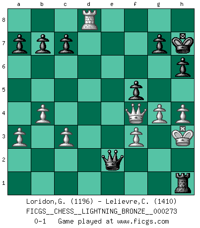Last move : 0-1 2012 March 13 17:7:28 [Event "FICGS__CHESS__LIGHTNING_BRONZE__000273"] [Site "FICGS"] [Date "2012.03.13"] [Round "1"] [White "Loridon,Geoffroy"] [Black "Lelievre,Clement"] [Result "0-1"] [WhiteElo "1196"] [BlackElo "1410"] 1.e4 e5 2.Nf3 Nc6 3.Nc3 Bb4 4.a3 Bc5 5.b4 Bd4 6.Bc4 h6 7.h4 Nf6 8.Rb1 d6 9.Bb2 Bg4 10.Nb5 Nxe4 11.Bxd4 Nxd4 12.Nbxd4 exd4 13.Qe2 d5 14.Bd3 O-O 15.Bxe4 dxe4 16.Qxe4 Re8 17.Ne5 f5 18.Qf4 Qd6 19.O-O Rxe5 20.g3 Rae8 21.f3 Bh3 22.Rfd1 Re2 23.c3 dxc3 24.dxc3 Qb6+ 25.Rd4 Re1+ 26.Rxe1 Rxe1+ 27.Kh2 Qb5 28.Rd8+ Kh7 29.g4 Qe2+ 30.Kxh3 Rh1+ 0-1 Three knights game Kingside Castling by player Black (move 14) Kingside Castling by player White (move 19) Player Black won this chess game. Follow this game move after move (download)At this time Fischer is simply a level above all the best Chessplayers in the world. (John Jacobs) Kasparov ist eine Art Monster mit hundert Augen, denen auch nicht das Geringste entgeht. (Tony Miles) Un buen jugador siempre tiene buena suerte. (José Raúl Capablanca) La solitude du joueur d'Echecs à l'approche du mat est semblable à celle du condamné. (Francis Szpiner) All war is based on deception. (Sun Tzu)