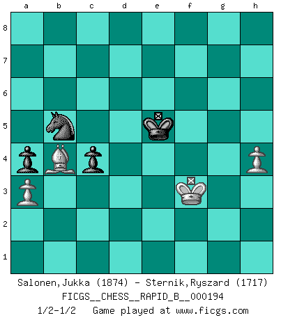 Last move : 1/2-1/2 2012 June 3 7:41:24 [Event "FICGS__CHESS__RAPID_B__000194"] [Site "FICGS"] [Date "2012.03.13"] [Round "1"] [White "Salonen,Jukka"] [Black "Sternik,Ryszard"] [Result "1/2-1/2"] [WhiteElo "1874"] [BlackElo "1717"] 1.e4 e5 2.Nf3 Nc6 3.Bb5 a6 4.Ba4 Nf6 5.O-O Be7 6.Re1 b5 7.Bb3 d6 8.c3 O-O 9.h3 Bb7 10.d4 Re8 11.Nbd2 Bf8 12.d5 Nb8 13.Nf1 Nbd7 14.Ng3 Nc5 15.Bc2 c6 16.b4 Ncd7 17.dxc6 Bxc6 18.Bb3 Nb6 19.Qd3 d5 20.exd5 Bxd5 21.Rxe5 Bxf3 22.Qxd8 Raxd8 23.Rxe8 Rxe8 24.gxf3 Re1+ 25.Kg2 Nfd5 26.Bb2 Nf4+ 27.Kh2 Rxa1 28.Bxa1 h5 29.Ne4 h4 30.Nc5 Bxc5 31.bxc5 Nc4 32.c6 Nd5 33.f4 Kf8 34.Bb2 Ke8 35.f5 a5 36.Bxc4 bxc4 37.Kg2 Kd8 38.Kf3 Kc7 39.Kg4 Kxc6 40.Kxh4 Kd6 41.Kg5 Ke5 42.h4 Ke4 43.Ba3 Nxc3 44.Bf8 f6+ 45.Kg4 Nd1 46.Bxg7 Nxf2+ 47.Kg3 Nd1 48.Bxf6 Kxf5 49.Bd8 a4 50.Kf3 Nc3 51.a3 Nb5 52.Be7 Ke6 53.Bb4 Ke5 1/2-1/2 Ruy Lopez : Closed Kingside Castling by player White (move 5) Kingside Castling by player Black (move 8) 10 pieces endgame at move 46 : White KBPPP , Black KNPPP WHITE : King + 1 Bishop 3 Pawns BLACK : King + 1 Knight 3 Pawns 9 pieces endgame at move 48 : White KBPPP , Black KNPP WHITE : King + 1 Bishop 3 Pawns BLACK : King + 1 Knight 2 Pawns 8 pieces endgame at move 48 : White KBPP , Black KNPP WHITE : King + 1 Bishop 2 Pawns BLACK : King + 1 Knight 2 Pawns This chess game ended in a draw. Follow this game move after move (download)In Chess, just as in life, today's bliss may be tomorrow's poison. (Assaic) Mit Schach schule ich mein Gefühl für Geometrie, was für Tennis und Schach gleichermaßen wichtig ist. (Boris Becker) Los libros de Ajedrez deben de usarse igual como usamos los anteojos: para mejorar la vista, aunque algunos jugadores los quieren usar como si ellos les otorgaran la vision. (José Raúl Capablanca) On n'a jamais que l'âge auquel on a commence à jouer aux échecs car après on cesse de vieillir. (Capablanca) The Internet isn't free. It just has an economy that makes no sense to capitalism. (Brad Shapcott)
