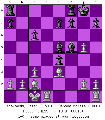 Last move : 1-0 2012 May 19 1:38:13 [Event "FICGS__CHESS__RAPID_B__000194"] [Site "FICGS"] [Date "2012.03.13"] [Round "1"] [White "Krakovsky,Peter"] [Black "Benone,Mateia"] [Result "1-0"] [WhiteElo "1730"] [BlackElo "1800"] 1.e4 c5 2.Nf3 Nc6 3.d4 cxd4 4.Nxd4 g6 5.Nc3 Bg7 6.Be3 Nf6 7.Be2 O-O 8.f4 d5 9.e5 Ne4 10.Nxc6 bxc6 11.Nxe4 dxe4 12.c3 Qxd1+ 13.Bxd1 g5 14.fxg5 Bxe5 15.Bc2 Bf5 16.O-O-O 1-0 This chess game has been lost on time (started : 2012.03.13 16:49:49) Sicilian : Accelerated Fianchetto, Modern variation Kingside Castling by player Black (move 7) Queenside Castling by player White (move 16) Player White won this chess game. Follow this game move after move (download)There's never before been a Chess player with such a thorough knowledge of the intricacies of the game and such an absolutely indomitable will to win. I think Bobby is the greatest player that ever lived. (Lisa Lane) Schach ist ein Kampf gegen den Fehler. (Johannes Herrman Zukertort) El arma más poderosa en el Ajedrez, es tener la próxima movida. (David Bronstein) Mais l'homme est une créature légère et illogique : semblable au joueur d'échecs, il n'aime que le processus du but à atteindre, non le but lui-même. (Dostoïevsky) No enterprise is more likely to succeed than one concealed from the enemy until it is ripe for execution. (Niccolo Machiavelli)