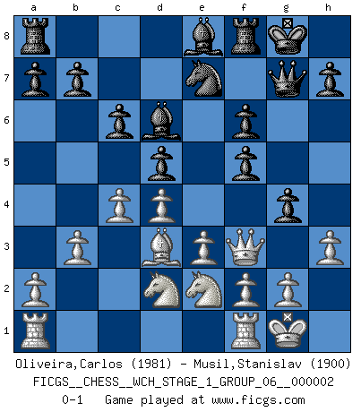 Last move : 0-1 2007 March 1 23:50:59 [Event "FICGS__CHESS__WCH_STAGE_1_GROUP_06__000002"] [Site "FICGS"] [Date "2007.01.16"] [Round "1"] [White "Oliveira,Carlos"] [Black "Musil,Stanislav"] [Result "0-1"] [WhiteElo "1981"] [BlackElo "1900"] 1.b3 f5 2.Bb2 Nf6 3.Bxf6 exf6 4.e3 d5 5.d4 Bd6 6.Bd3 Nc6 7.Ne2 O-O 8.c3 Qe8 9.O-O Qh5 10.h3 Ne7 11.Nd2 c6 12.Nf4 Qh6 13.Qf3 Bd7 14.c4 g5 15.Qh5 Qg7 16.Ne2 Be8 17.Qf3 g4 0-1 Nimzovich-Larsen attack : Dutch variation Kingside Castling by player Black (move 7) Kingside Castling by player White (move 9) Player Black won this chess game. Follow this game move after move (download)If you aren't afraid of Spassky, then I have removed the element of money. (Jim Slater) Im Schach nämlich geht es darum, daß Ich des Gegners klein zu kriegen, sein Ego zu zerbrechen und zu zermahlen, seine Selbstachtung zu zertreten und zu verscharren und seine ganze mißachtenswerte sogenannte Persönlichkeit ein für alle Mal tot zu hacken und zu zerstampfen und dadurch die menschliche Gesellschaft von einer stinkenden Pestbeule zu befreien. Es ist ein königliches Spiel. (Robert James Fischer) El Ajedrez es tan interesante por sí solo, que no es necesario un interés monetario para persuadir a una persona a que lo practique; por lo tanto, nunca se juega por dinero. (Benjamin Franklin) Les échecs sont plus proches de l'art de l'assassinat que de l'art de la guerre. (Arturo Perez-Reverte) Whoever said the pen is mightier than the sword obviously never encountered automatic weapons. (US General Douglas MacArthur)